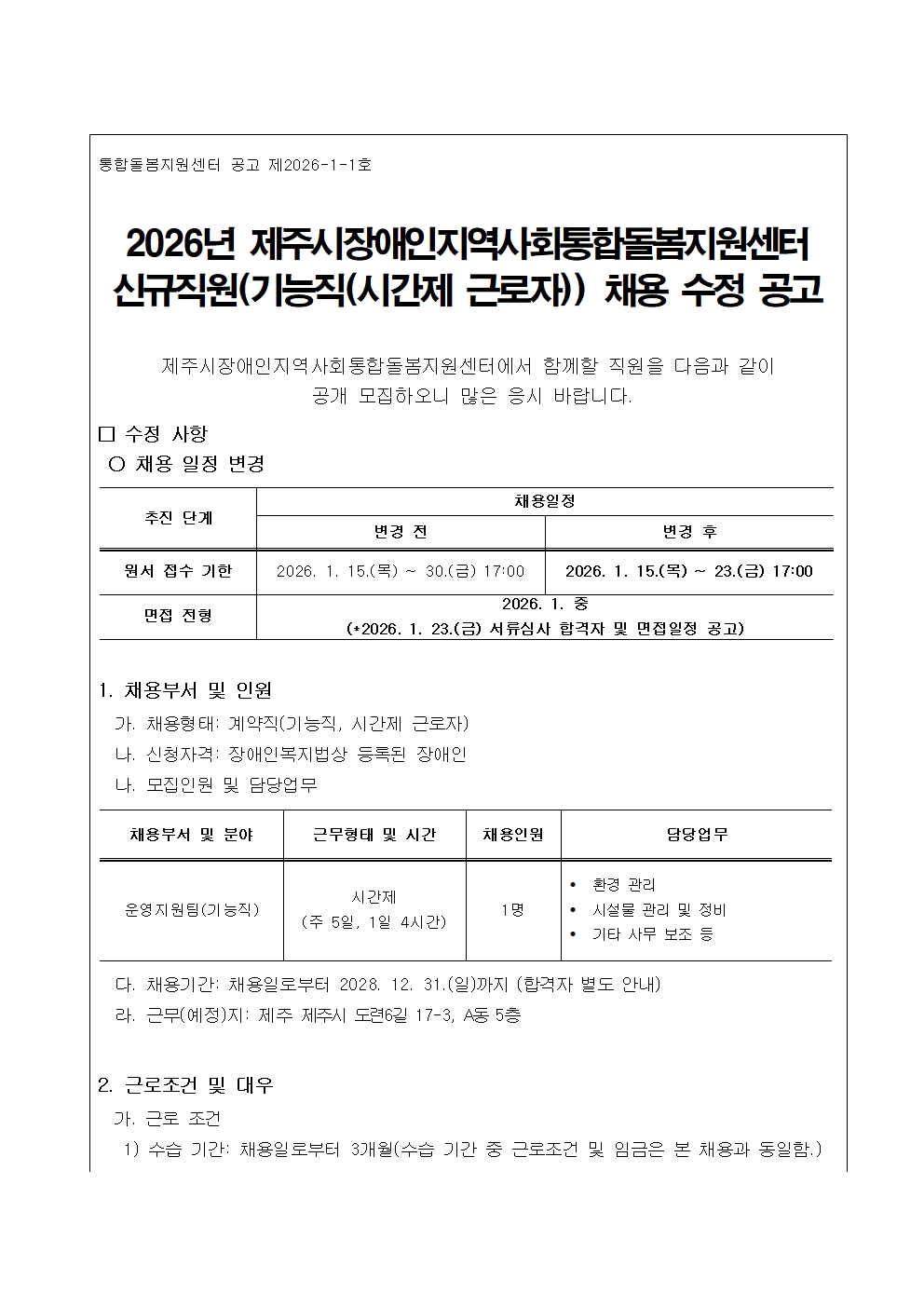 신규직원(기능직, 시간제근로자) 채용 수정 공고 알림