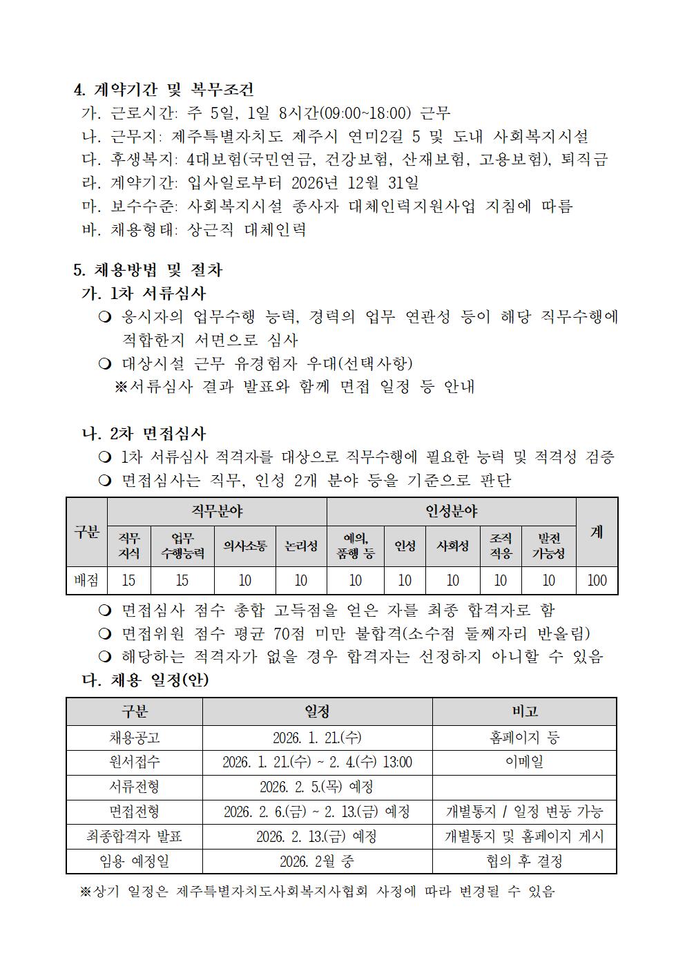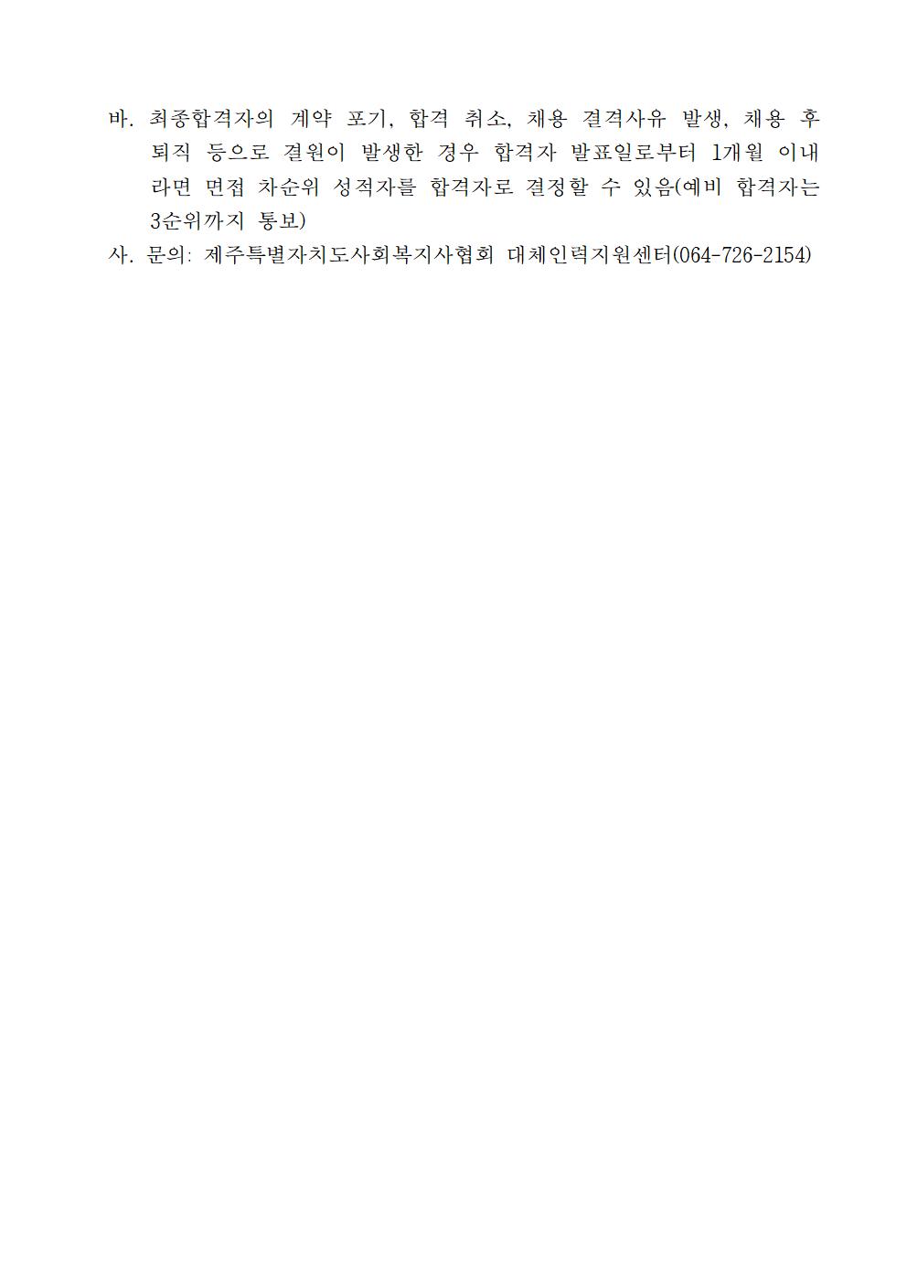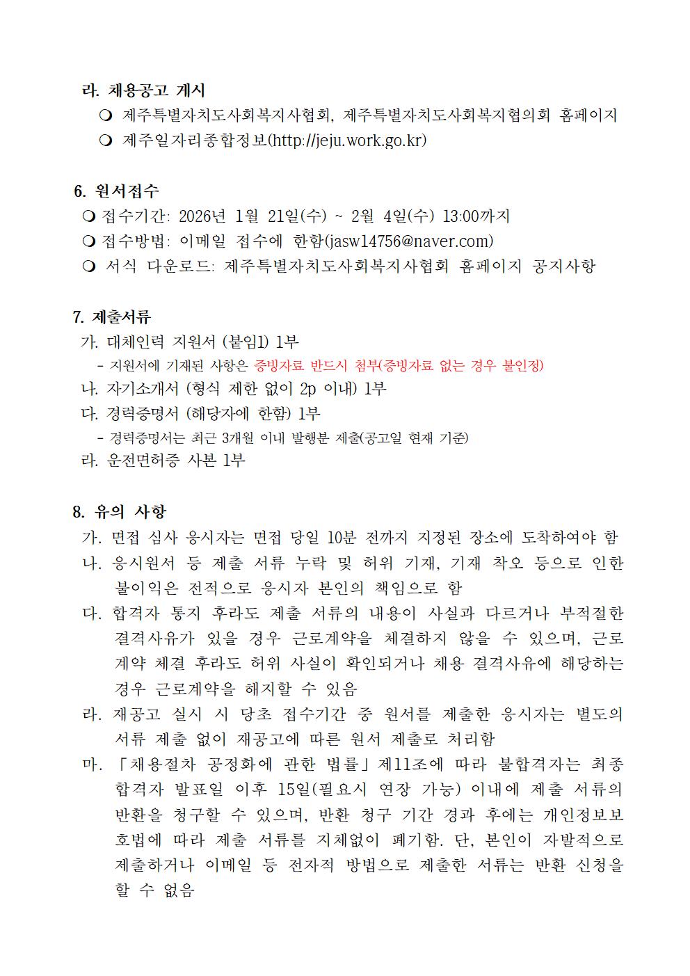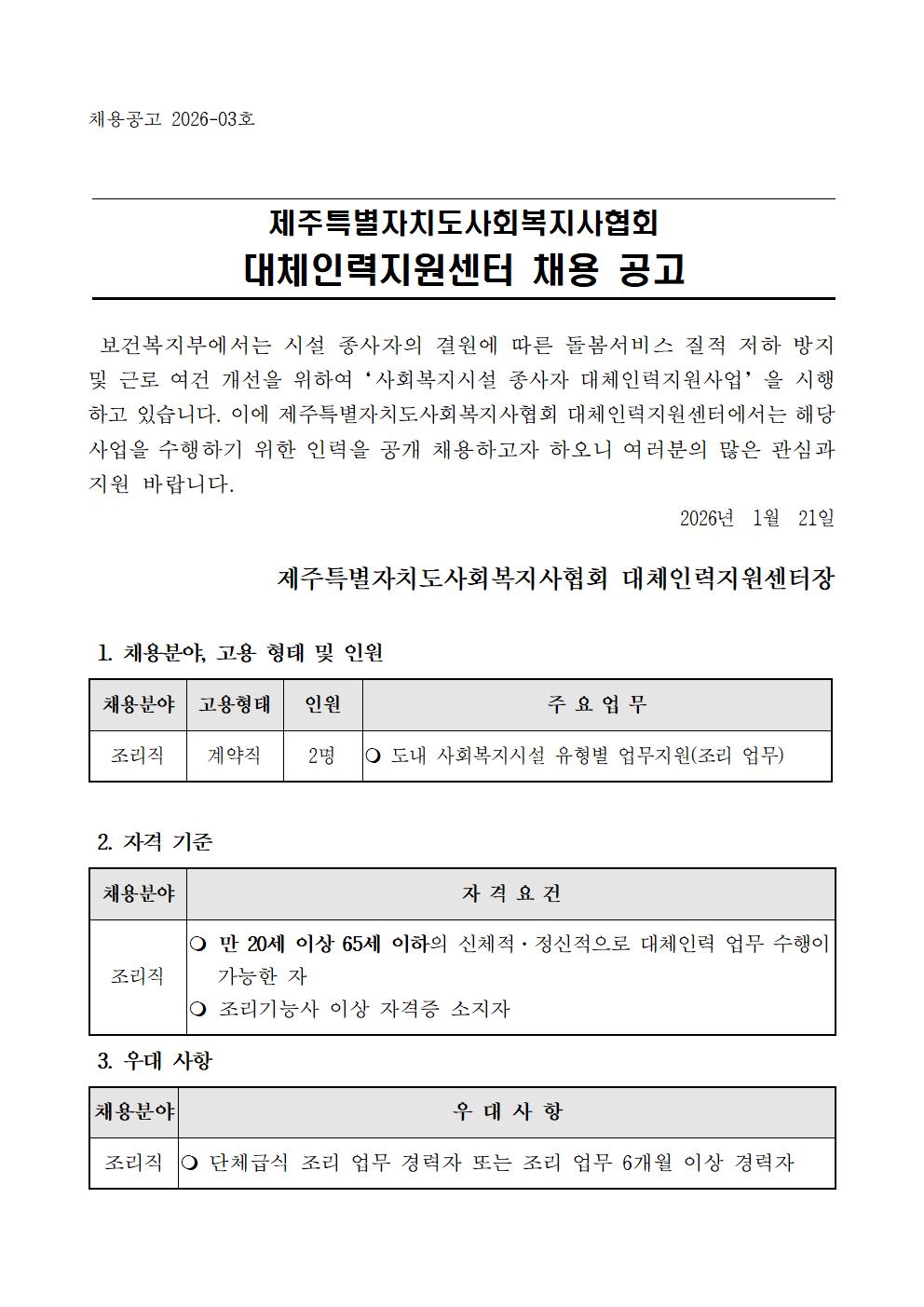 2026년도 제2차 제주특별자치도사회복지사협회 대체인력지원센터 직원 채용 공고(조리직)