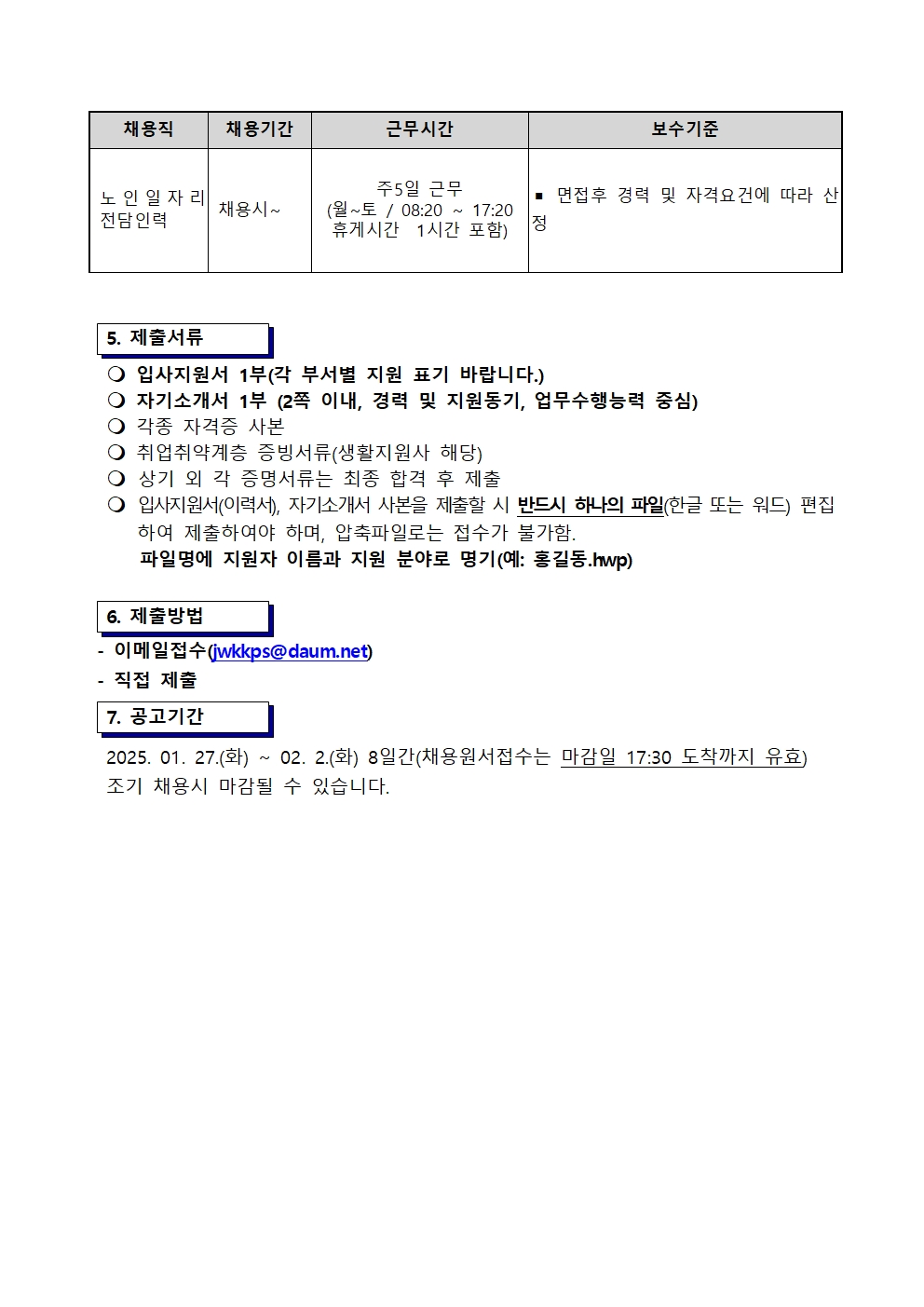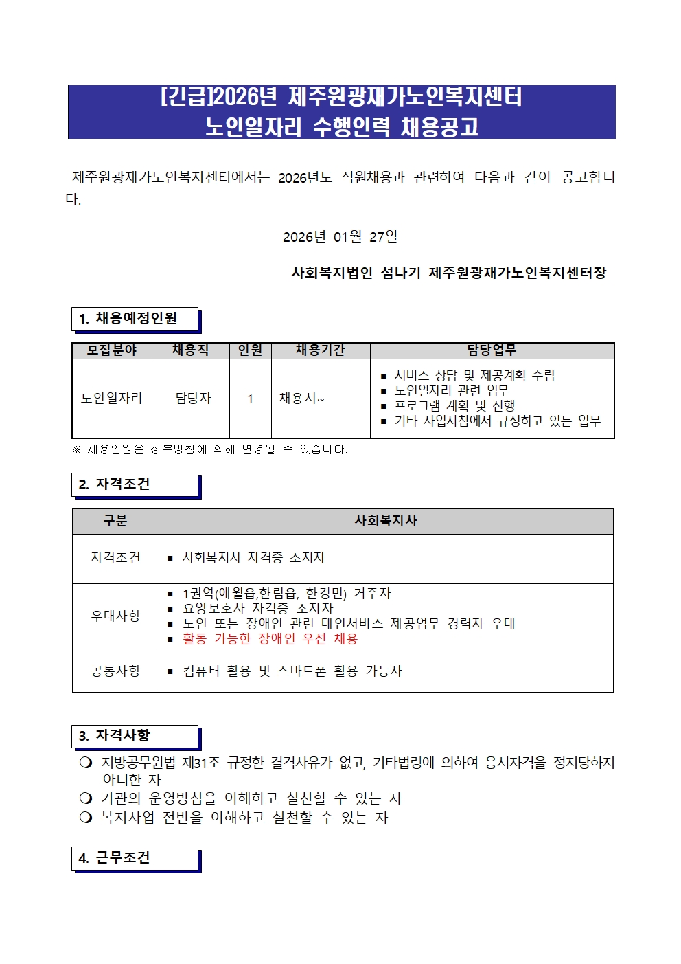 [긴급]2026년 제주원광재가노인복지센터 노인일자리 수행인력 채용공고