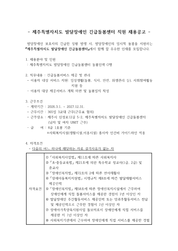 -제주특별자치도 발달장애인 긴급돌봄센터 직원 채용공고-