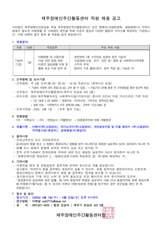 [재공고]제주장애인주간활동센터 직원채용공고(7급 기능직)