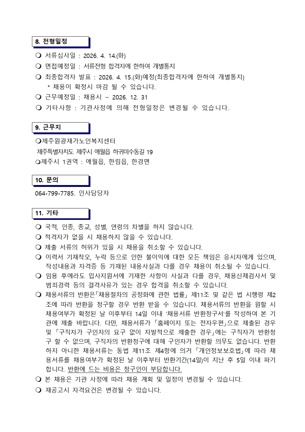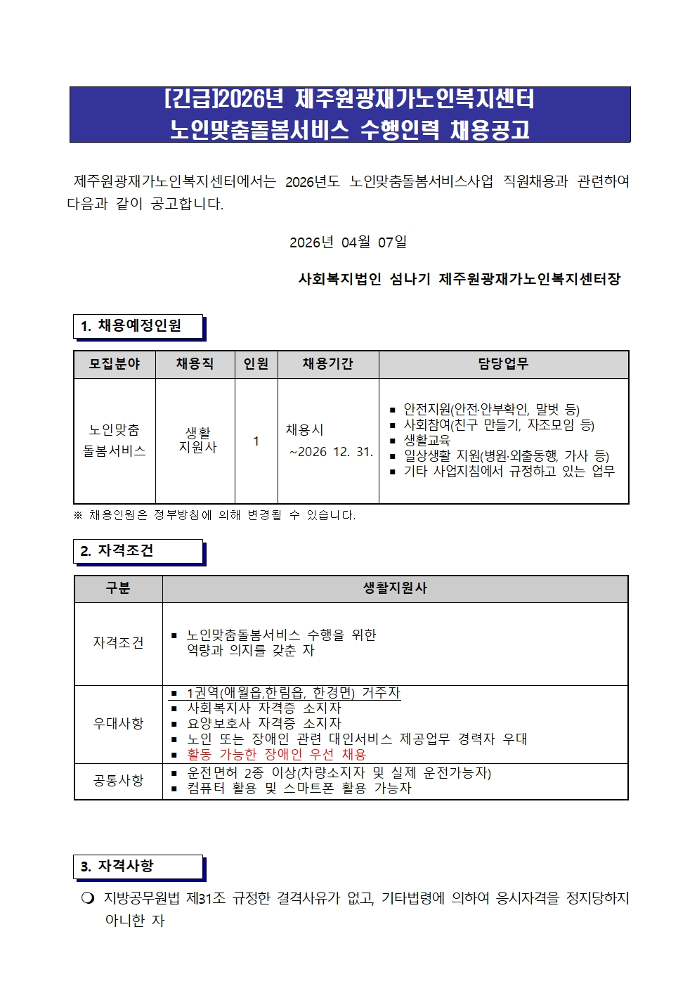 [긴급]2026년 제주원광재가노인복지센터 노인맞춤돌봄서비스 수행인력 채용공고