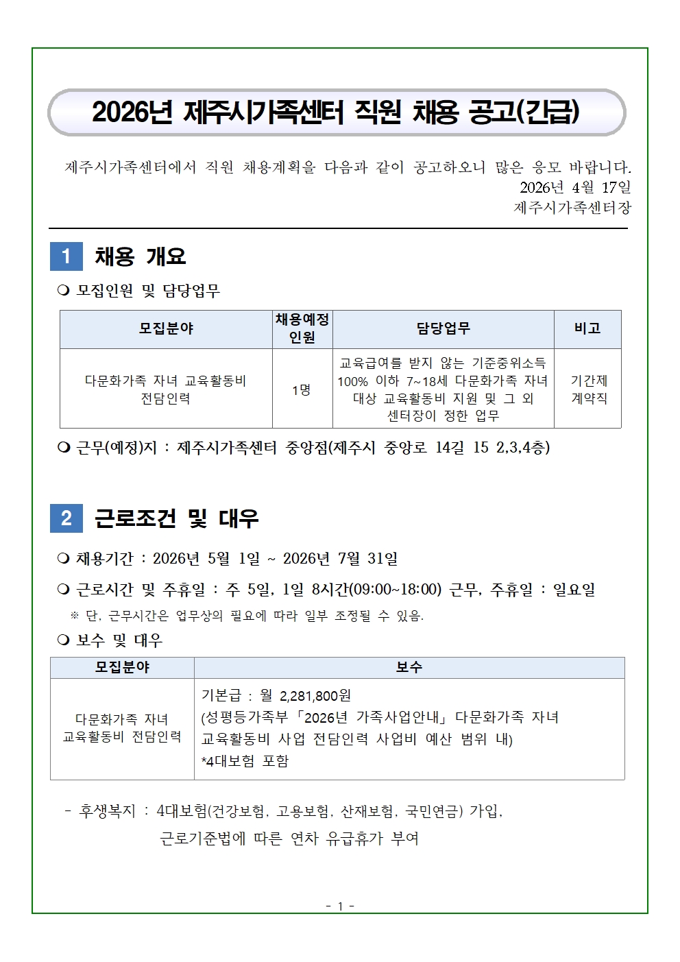 2026년 제주시가족센터 직원 채용 공고(긴급)