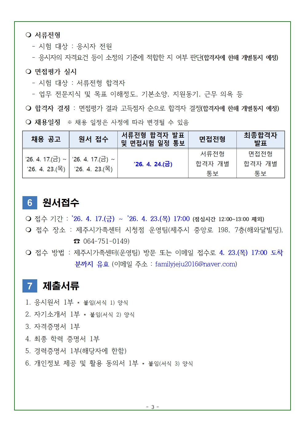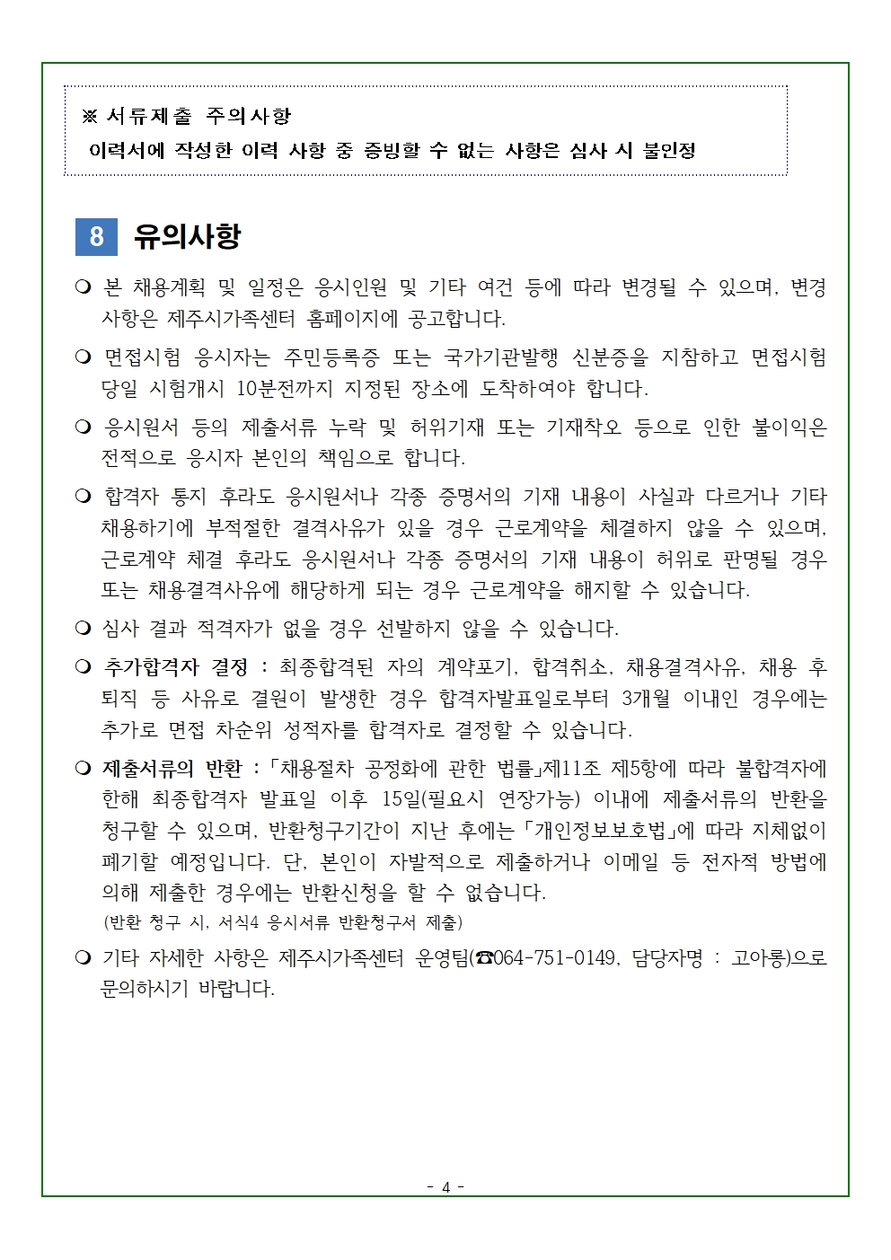 ○ 본 채용계획 및 일정은 응시인원 및 기타 여건 등에 따라 변경될 수 있으며, 변경 사항은 제주시가족센터 홈페이지에 공고합니다.