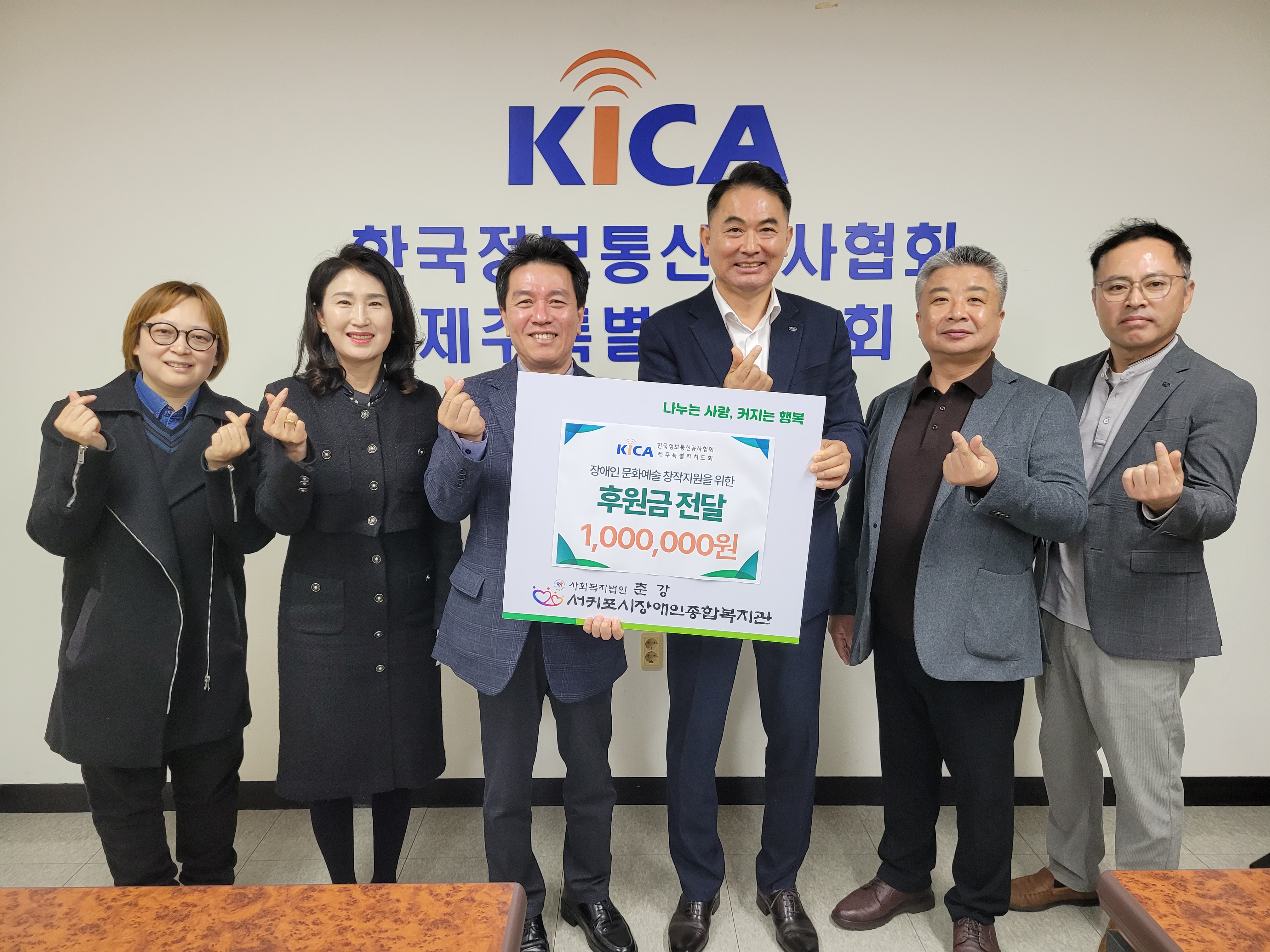 한국정보통신공사협회 제주특별자치도회(회장 양방훈)는 11월 25일(화), 제주특별자치도회 사무실에서 서귀포시장애인종합복지관(관장 윤보철)에 후원금 100만 원을 전달했다.