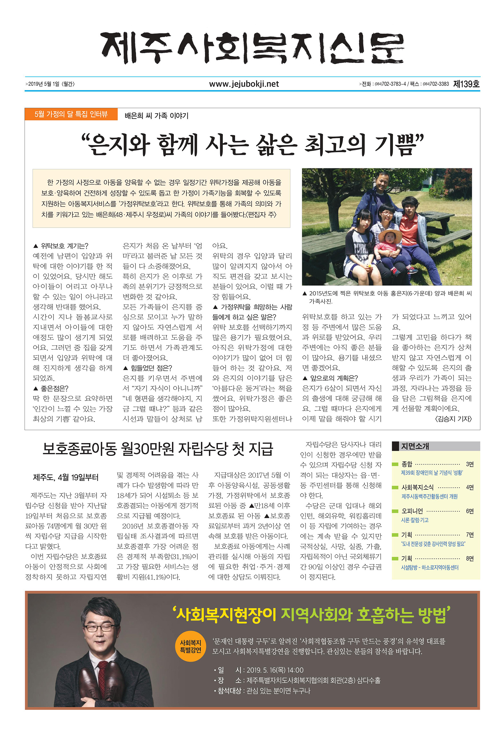 | 제주사회복지신문 제139호(2019.5.1)지면소개 | |