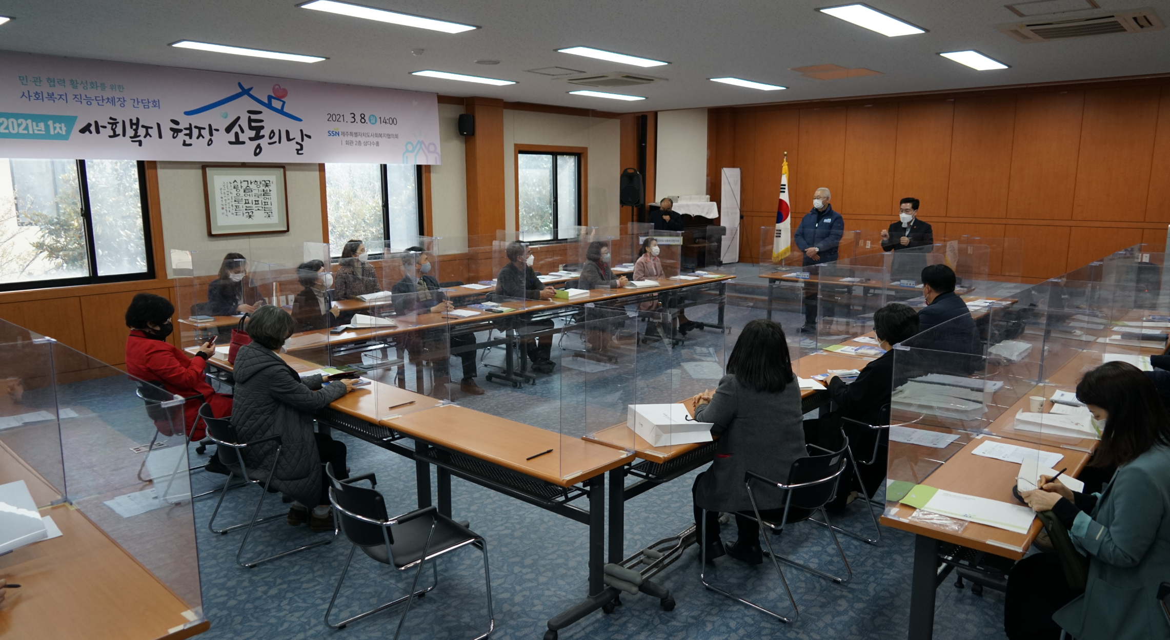 어제(8일) 협의회 삼다수홀에서 사회복지 직능단체 대표자와 제주도 보건복지여성국 임태봉 국장님을 비롯한 관계 공무원 5명이 참석한 가운데 ‘민·관 협력과 소통 활성화를 위한 사회복지 현장 소통의 날’ 간담회가 개최되었습니다.