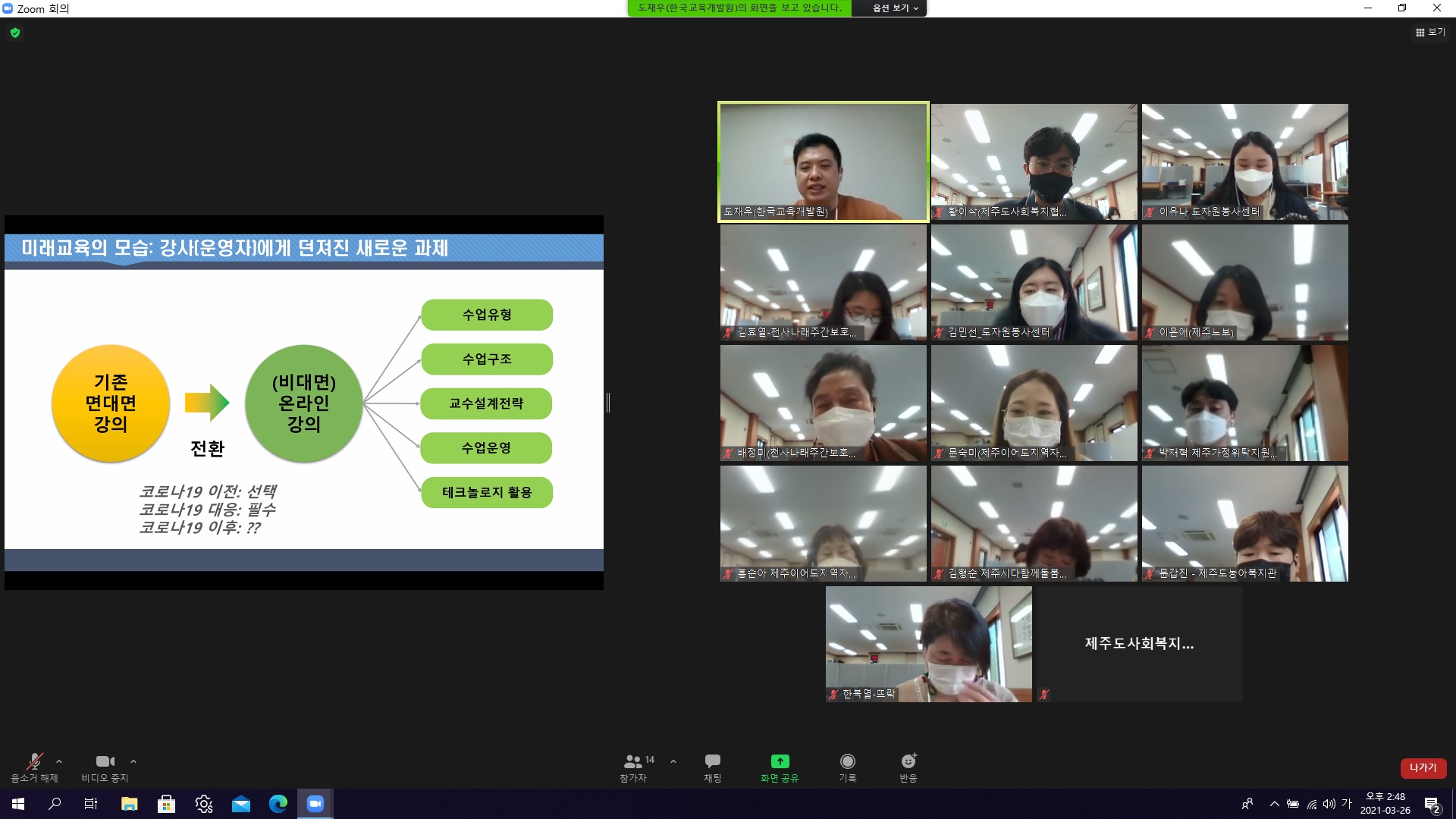 우리 협의회에서는 지난 3. 26(금) 오후 회관 삼다수홀에서 '실시간 온라인 강의·회의 운영을 위한 비대면 플랫폼(ZOOM) 활용교육'을 실시했습니다.