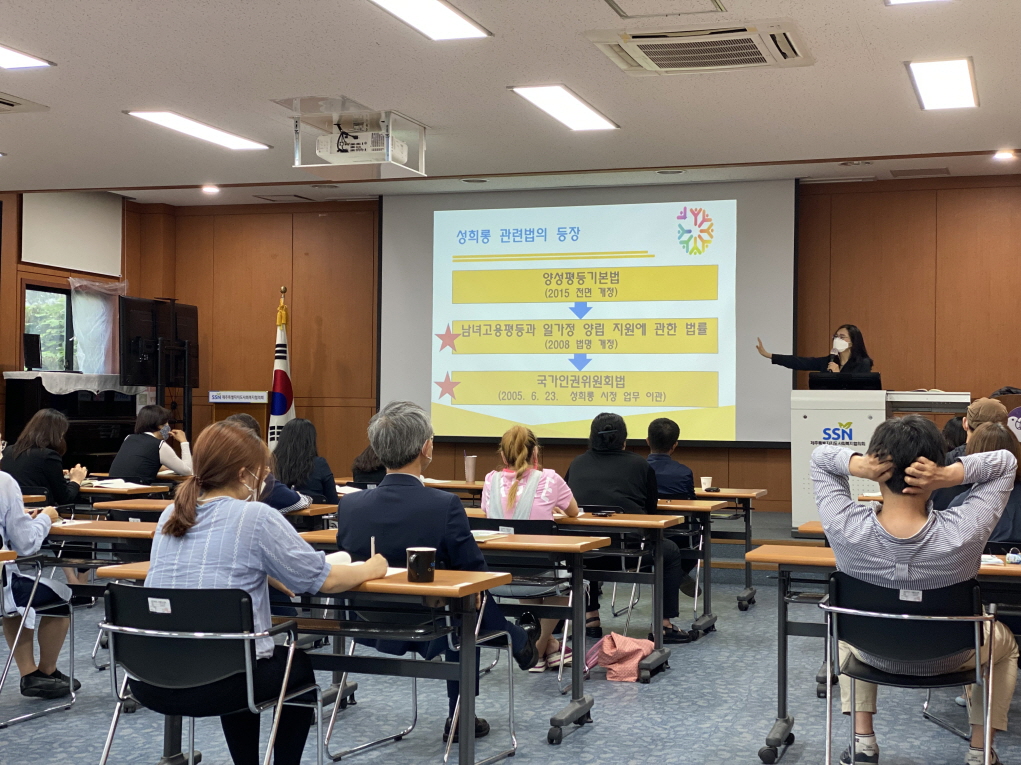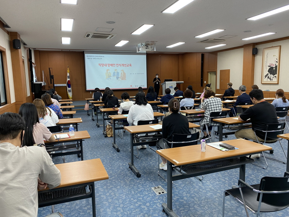 이날 교육은 사회복지시설에서 수강해야하는 법정의무교육 과목 중 인권(강사: 평화민주인권교육 '인' 장소영 공동대표), 직장 내 장애인 인식개선(강사: 도 장애인종합복지관 장애인식개선교육 서향미 위촉강사), 성희롱 예방(강사: 한국양성평등진흥원 폭력예방교육 강지영 전문강사) 등 3가지 과목에 대해 강의를 진행했습니다.