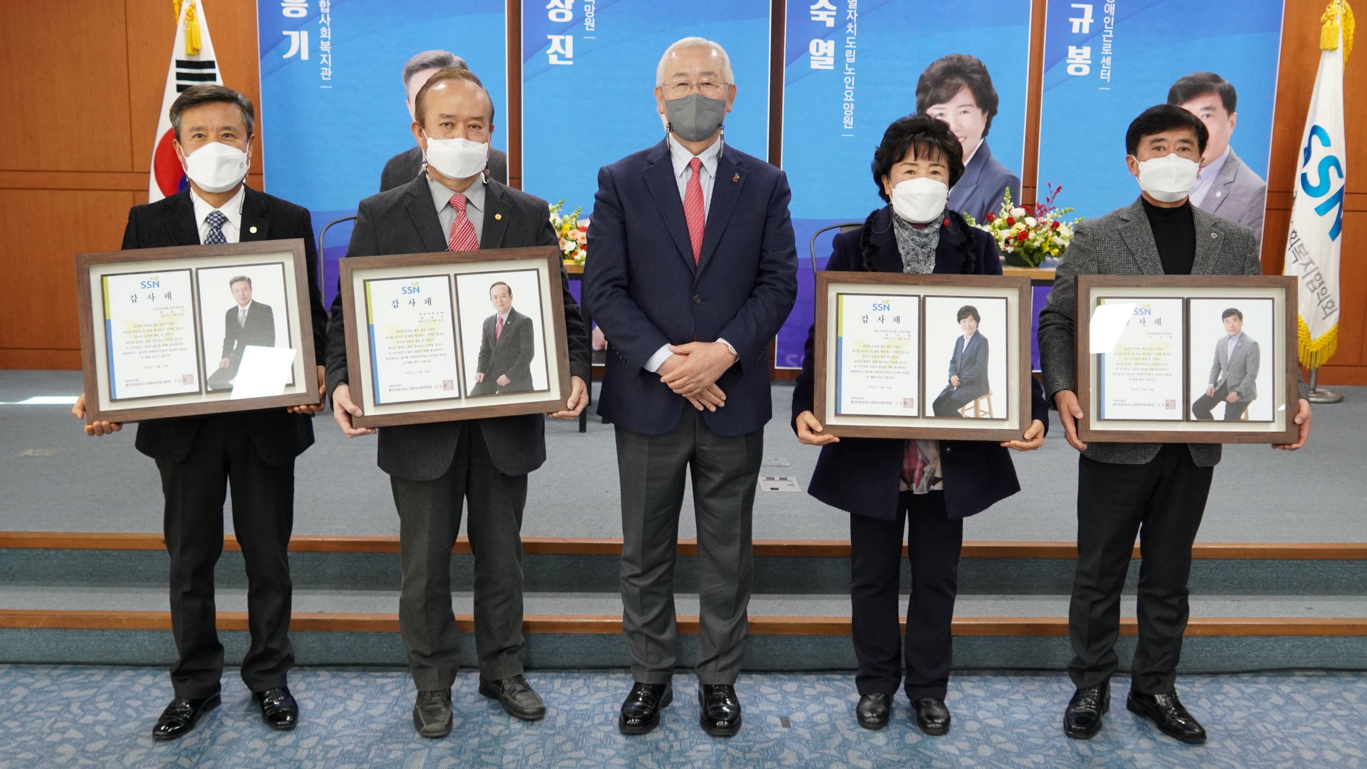 2021년도 하반기 정년퇴임자 (서귀포종합사회복지관 윤흥기, 제주시희망원 한상진, 제주특별자치도립노인요양원 현숙열, 춘강장애인근로센터 이규봉님)을 대상으로 회장님의 축사, 퇴임자별 퇴임사, 감사패 전달 등의 순서로 진행됐습니다.