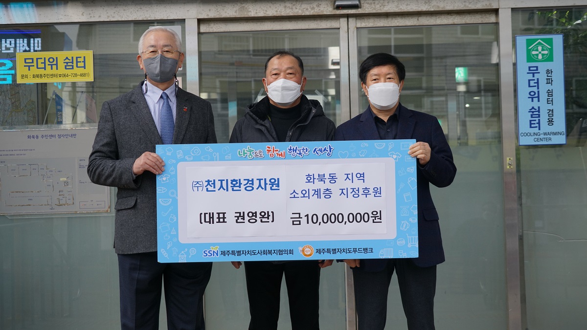 ㈜천지환경자원(대표 권영완)에서는 작년 12월 31일 화북동주민센터에서 제주특별자치도사회복지협의회(회장 고승화)에 화북동 지역 소외계층 지정후원금(금10,000,000)을 전달해주셨습니다.
