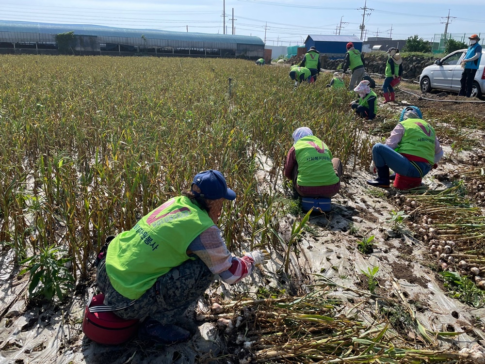대정읍 하모리 마늘밭 농가를 방문하여 마늘수확 봉사활동을 실시했습니다.