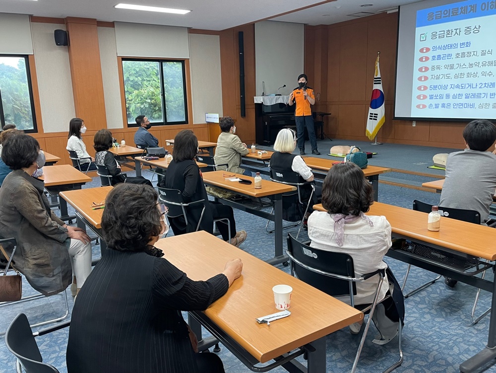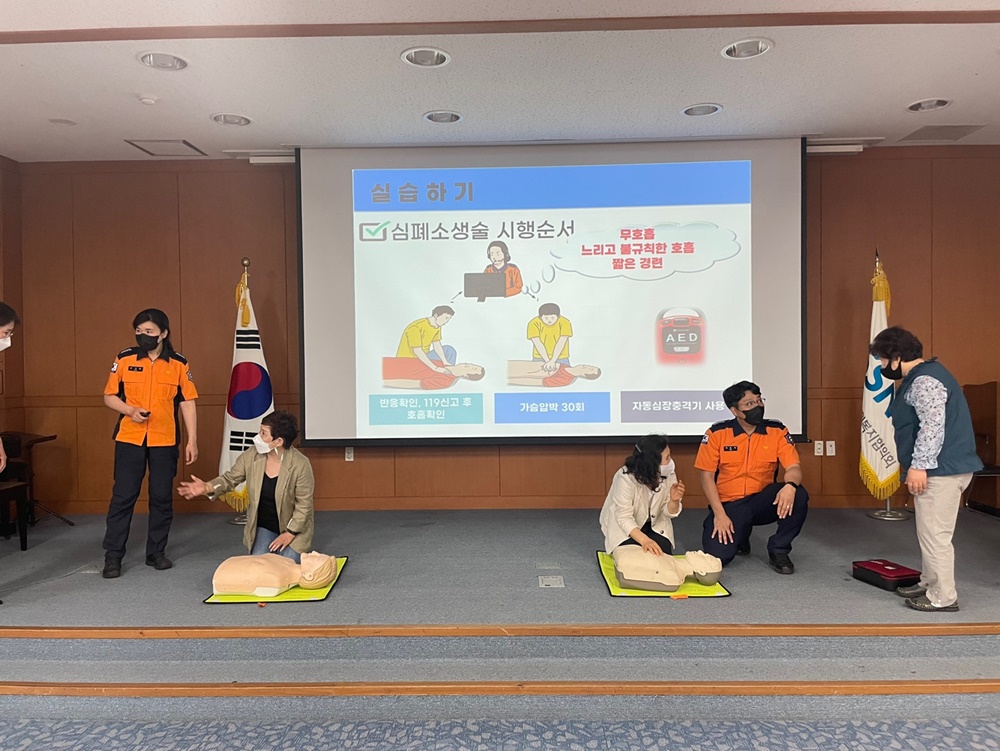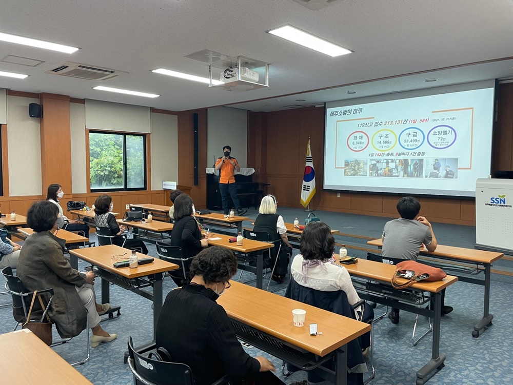 이날 교육은 제주소방서 예방안전과 강사 두 분을 초빙하여 화재예방 안전교육과 응급처치 교육, 심폐소생술 실습 순으로 총2시간 동안 진행됐습니다.