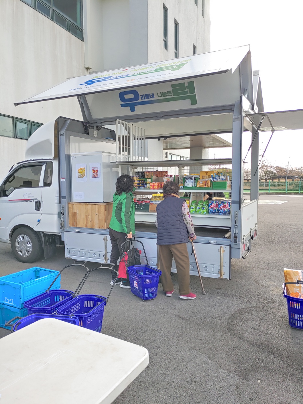 거동이 불편하신 어르신들께서 요양사님들의 차를 타고 오셔서 직접 물품을 고르시는