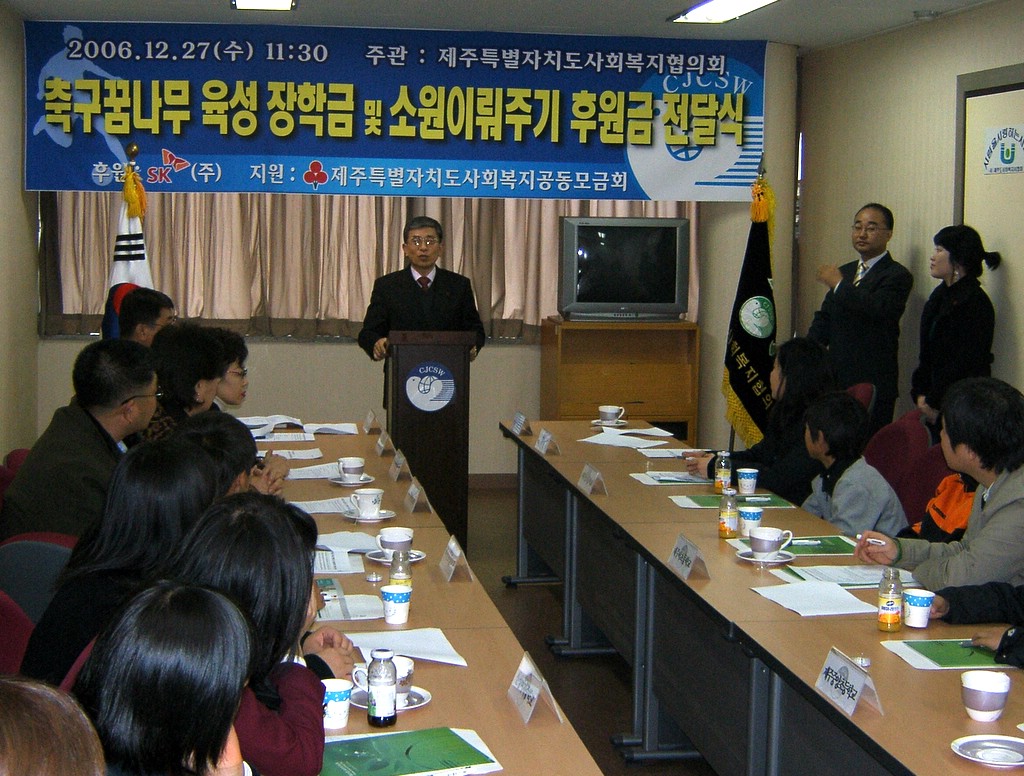 지난 12월 27일 제주사회복지협의회에서는 SK(주)와 사회복지공동모금회 관계자 등과 함께 올 하반기동안‘꿈이루기 성장프로그램’에 참여한 저소득가정 초·중학생 중 33명을 대상으로 2천2백여만원의 장학금과 후원금을 전달하였다.