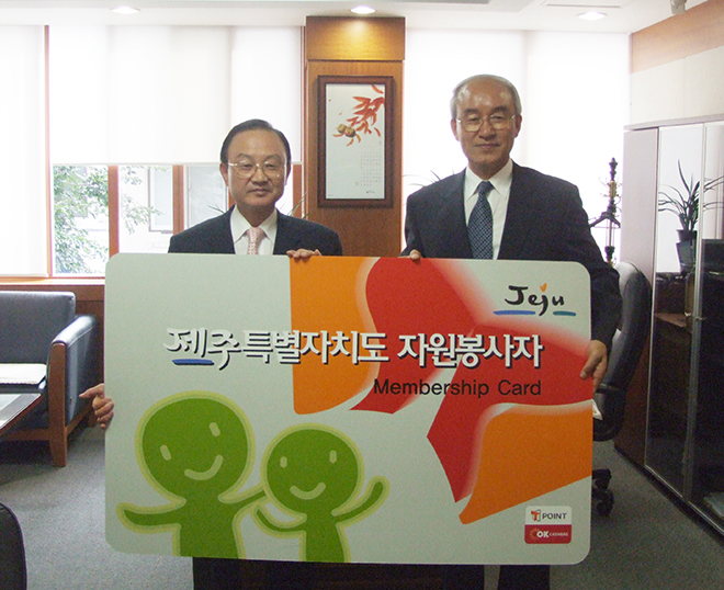 신청서는 제주은행 임직원을 대표해 부영기 부행장님(사진 왼쪽)께서 우리 협의회 고경윤 상근부회장님께 전달하였으며, 제주은행에서는 '제주자원봉사카드'발급신청을 계기로 다양하고 적극적인 자원봉사활동 방안 모색을 통해 제주지역 사회복지발전에 기여하기로 했습니다.