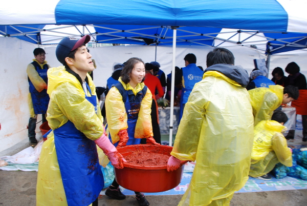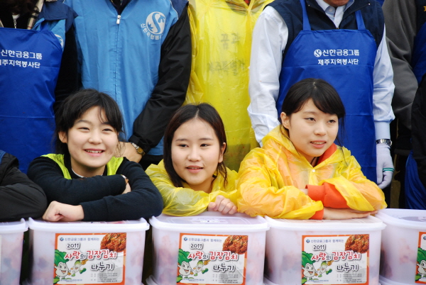 지난 12월 3일 제주특별자치도사회복지협의회(회장 이동한)가 주최하고 제주특별자치도사회복지협의회 자원봉사연합회(회장 고경남)가 주관하며 신한금융그룹이 후원하는 ‘2011 사랑의 김장김치 나누기’사업이 사회복지협의회 회관 앞마당에서 제주지역 신한금융그룹 직원과 자원봉사자 150여명이 참여한 가운데 진행됐습니다.