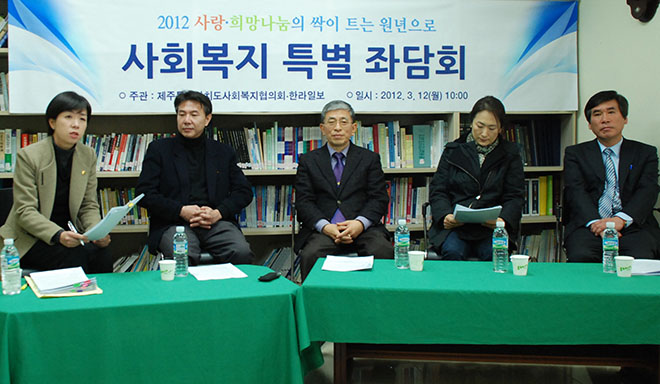 이날 좌담회에는 이동한 회장, 박주희 제주특별자치도의회 의원, 강승수 제주특별자치도 보건복지여성국장, 권순용 제주국제학교 사회복지학과 교수, 양은심 제주사회적기업협의회장 등 5명의 패널이 참석해 제주 사회복지 발전 방향에 대해 의견을 나누고 토론을 펼쳤습니다.