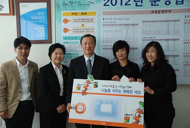 이번 성금은 수채화동아리가 2012 제주시평생학습대회에서 작품전시 단체전 최우수상 수상으로 받은 상금 40만원과 수채화동아리 회원 임영숙씨가 체험수기 개인학습자 분야에서 우수상 수상으로 받은 상금 20만원 전액이랍니다.