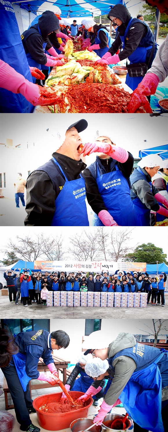 지난 11월 17일 제주특별자치도사회복지협의회(회장 이동한)가 주최하고 제주특별자치도사회복지협의회 자원봉사연합회(회장 이백만)가 주관하며 제주은행과 신한금융그룹이 후원하는 ‘2012 사랑의 김장김치 나누기’사업이 사회복지협의회 회관 앞마당에서 제주지역 제주은행, 신한금융그룹 직원과 자원봉사자 150여명이 참여한 가운데 진행됐습니다.