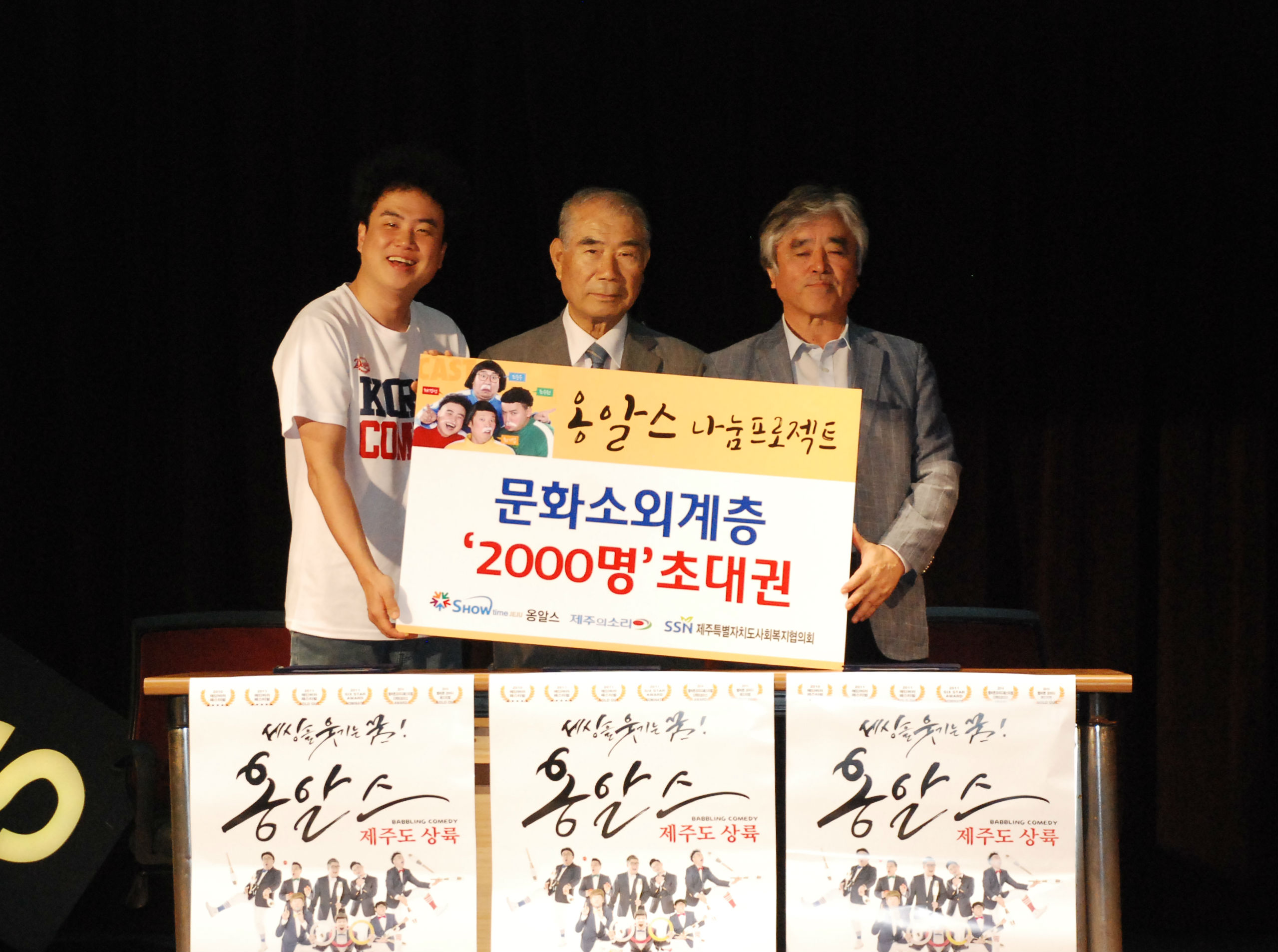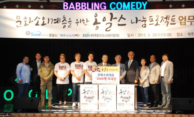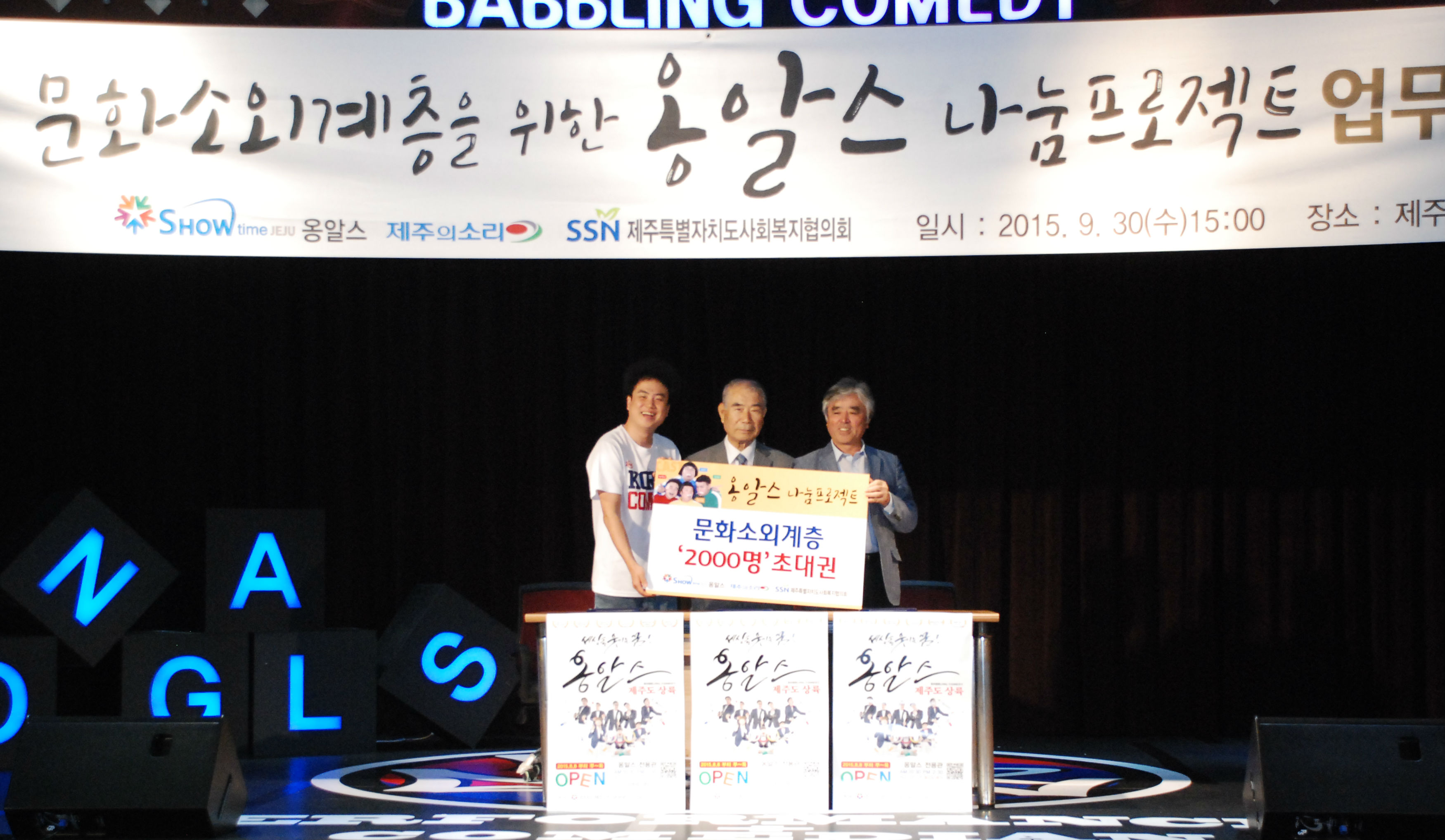 제주특별자치도사회복지협의회(회장 고치환)는 쇼타임제주(주)옹알스(대표 고제훈), 제주의소리(대표 고홍철)와 지난 30일 제주시 조천읍에 위치한 옹알스 제주전용극장에서 ‘문화소외계층을 위한 옹알스 나눔 프로젝트’ 업무협약을 체결했습니다.
