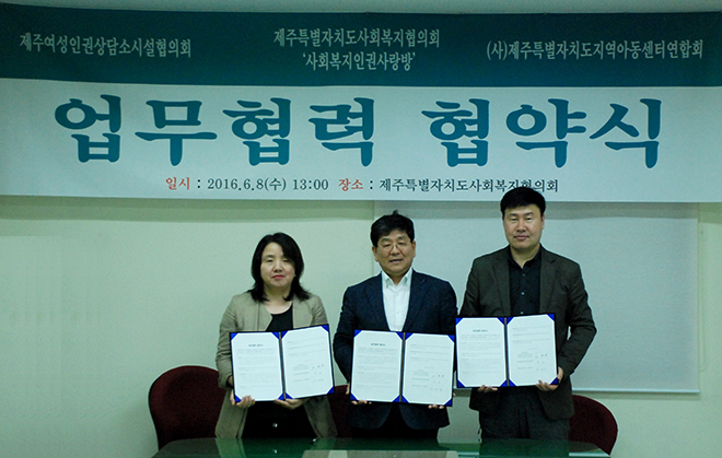 사회복지인권사랑방(운영위원장 : 고관용)은 2016. 6. 8(수) 13:00 제주여성인권상담소시설협의회(회장: 허순임), 사)제주특별자치도지역아동센터연합회(회장 : 석 건)과 취약계층과 사회복지시설종사자 지원을 위한 업무협약을 제주특별자치도사회복지협의회 소회의실에서 체결했습니다.
