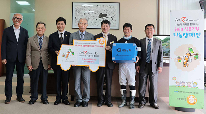 이날 전달식에는 한국마사회 제주본부 유관단체인 제주마주협회(강진일 회장), 제주마주협회 강태민 마주, 조교사협회(산성배 회장), 기수협회(문성호 회장) 외 렛츠런파크제주(최원일 본부장) 직원과 PA(아르바이트생)분들이 10월 1일부터 14일까지 라면, 세제 등 약 300만원 상당의 물품을 2주간 모아 주신 물품을 전달해 주셨습니다.