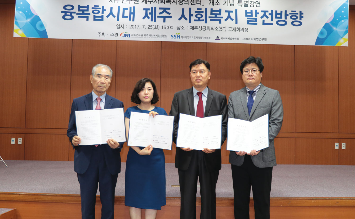 제주연구원 제주사회복지창의센터(센터장 심경수), (사)사회복지법제학회(회장 최승원), (사)자치법연구원(이사장 홍정선)과 제주지역 사회복지발전을 위한 업무협약을 체결했습니다.