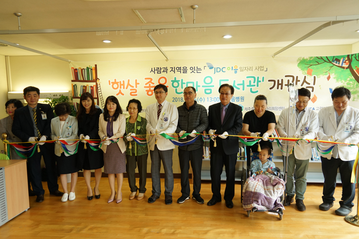 '햇살 좋은 한마음 도서관'은 JDC가 주최하고 저희 사회복지협의회와 제주중장년일자리희망센터, 제주YWCA고령자인재은행이 주관하는 중장년일자리사업인 'JDC이음 일자리 사업' 중 '움직이는 도서관 사서' 사업단의 활동공간을 한마음병원에서 제공하면서 개관하게 됐습니다.