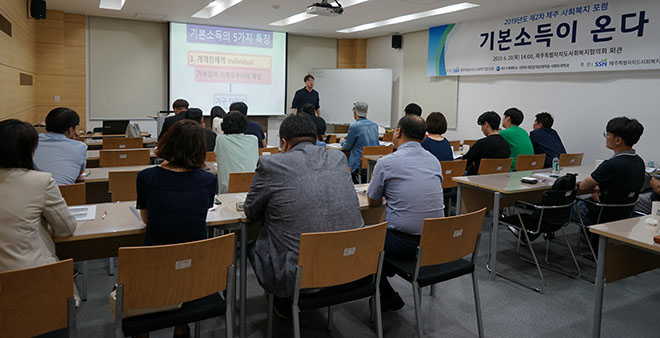 제주도내 사회복지 종사자, 도민 등이 참석한 이번 포럼은 김찬휘 정치경제연구소 대안 부소장이 맡아 최근 화두가 되고 있는 ‘기본소득’을 주제로 다양한 이야기를 나눴습니다.