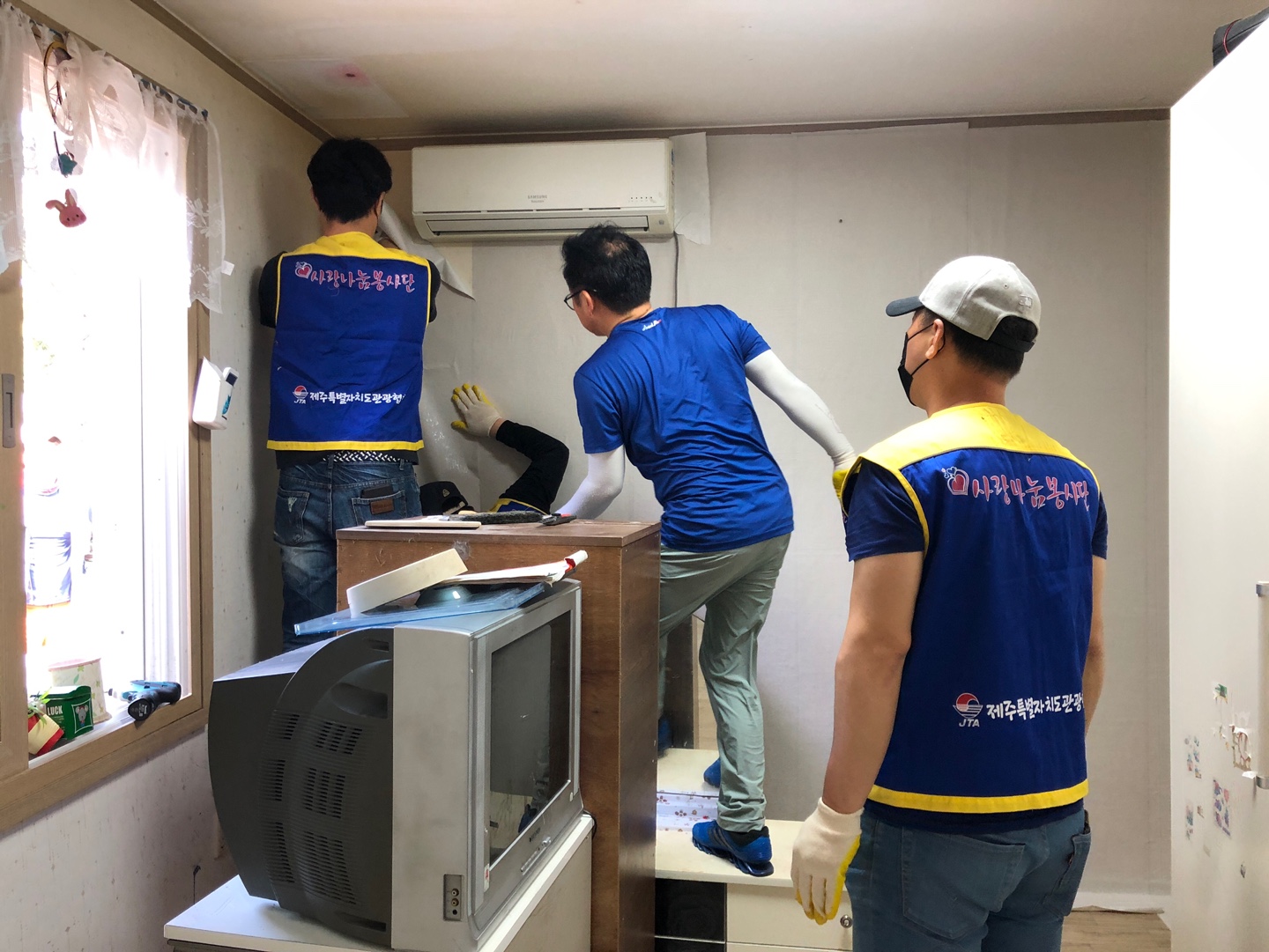이 사업은 제주관광협회 사회공헌활동으로 협회 임직원들이 매월 모아놓은 기금으로 운영되며, 이번에 제주시 애월읍에 거주하고 있는 장애인·다문화가정을 방문하여 도배 및 지붕수리, 주변 환경정화활동을 실시하였습니다.
