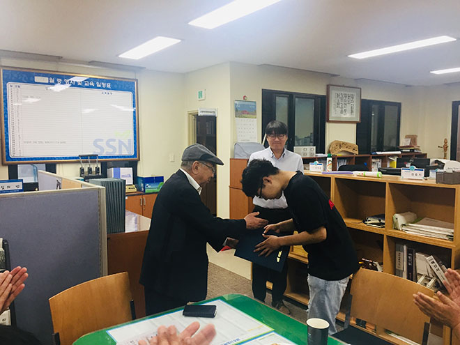 사회복무요원에게 감사의 마음을 담아 사회복지협의회장님의 표창장을 전달했습니다. 그리고 전체 사회복무요원