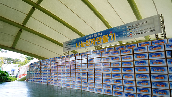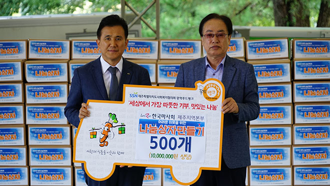 지난 9. 28일 한국마사회 제주지역본부(본부장 송철희)에서 이웃돕기 나눔상자 500개를 만들어 우리 협의회로 후원하였습니다. 나눔상자는 광역푸드뱅크를 통해 기부식품을 제공받고 있는 어려운 이웃에게 전달될 예정입니다. 후원해주신 한국마사회 제주지역본부에 다시 한번 감사드립니다.