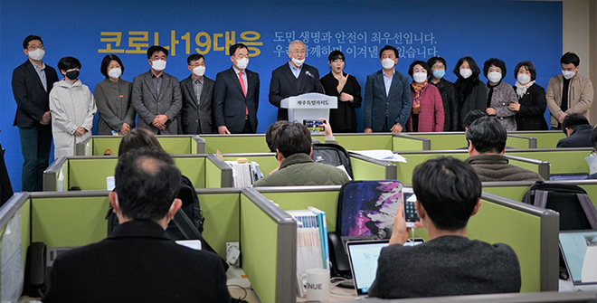 제주사회복지협의회장을 비롯한 제주사회복지공동모금회장, 18개 사회복지직능단체장은 오늘 오전 11시 제주특별자치도청 기자실에서 <코로나19 극복을 위한 사회복지계 결의문>을 발표해 「코로나19」로부터 청정한 제주복지환경을 지켜내는데 최선을 다 하겠다는 의지를 표명했습니다.