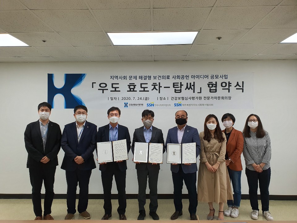 건강보험심사평가원(심평원)에서 주관한 '보건의료 사회공헌 아이디어 공모전'에 저희 협의회에서 제안한 '우도 효도차 - 탑써' 사업이 선정됨에 따라 지난 7. 24일 심평원 서울분원에서 업무협약식이 진행되었습니다.