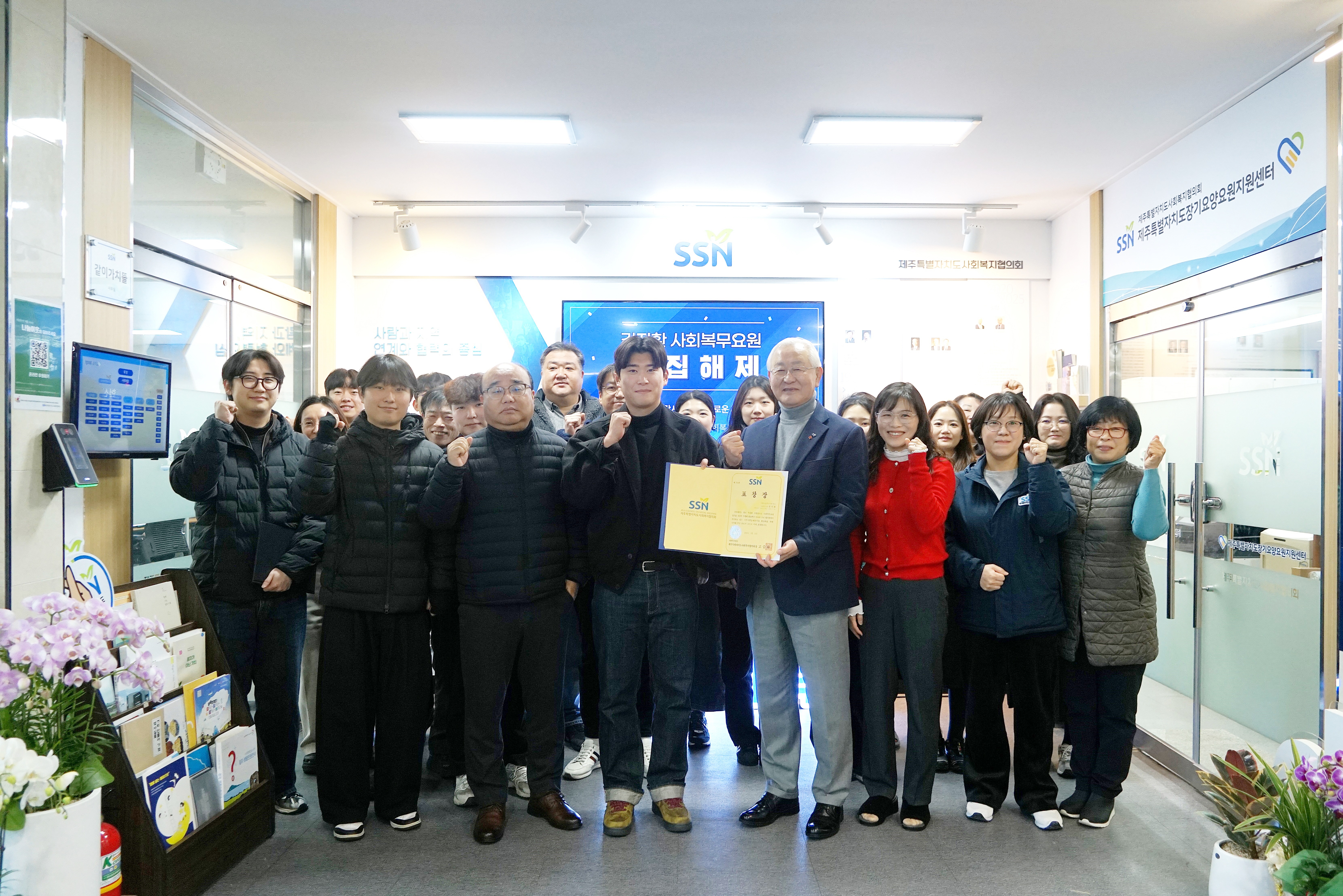 제주특별자치도사회복지협의회장 표창장을 수여하고 협의회 직원 모두가 축하를 전했습니다.