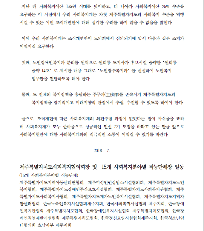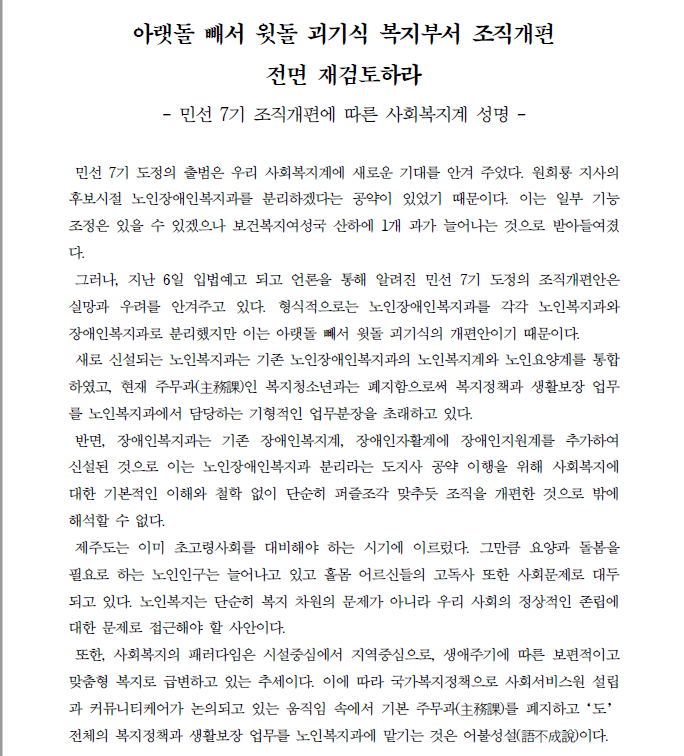 민선 7기 조직개편에 따른 사회복지계 성명 발표