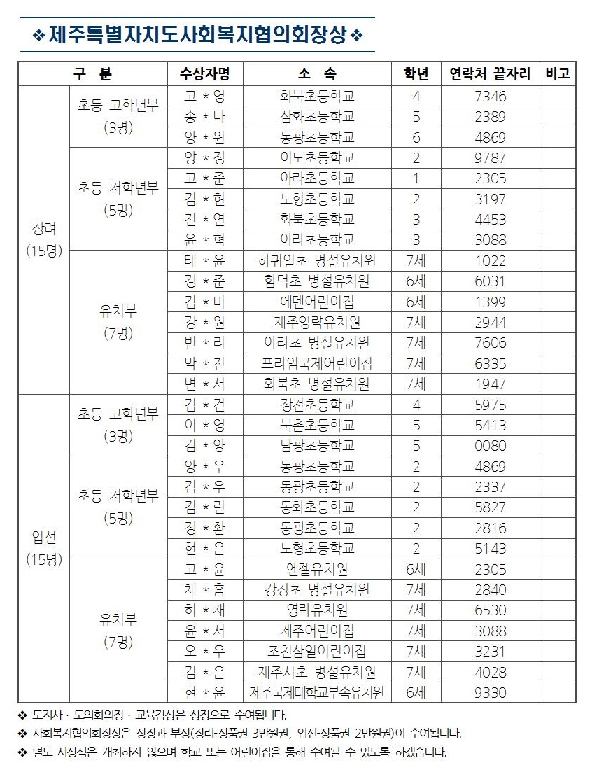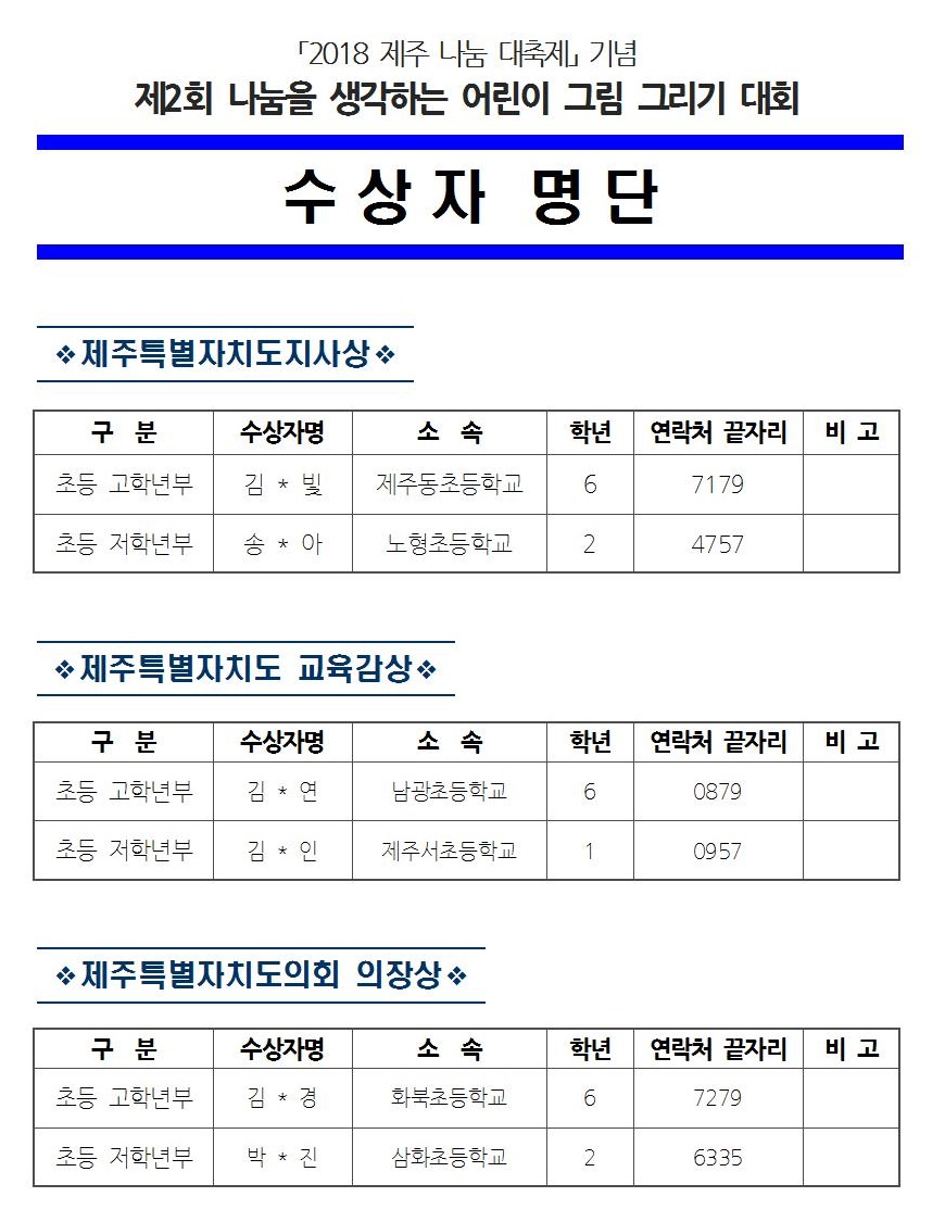 2018 제주나눔대축제 기념 "나눔을 생각하는 어린이 그림 그리기 대회" 수상자 명단 안내