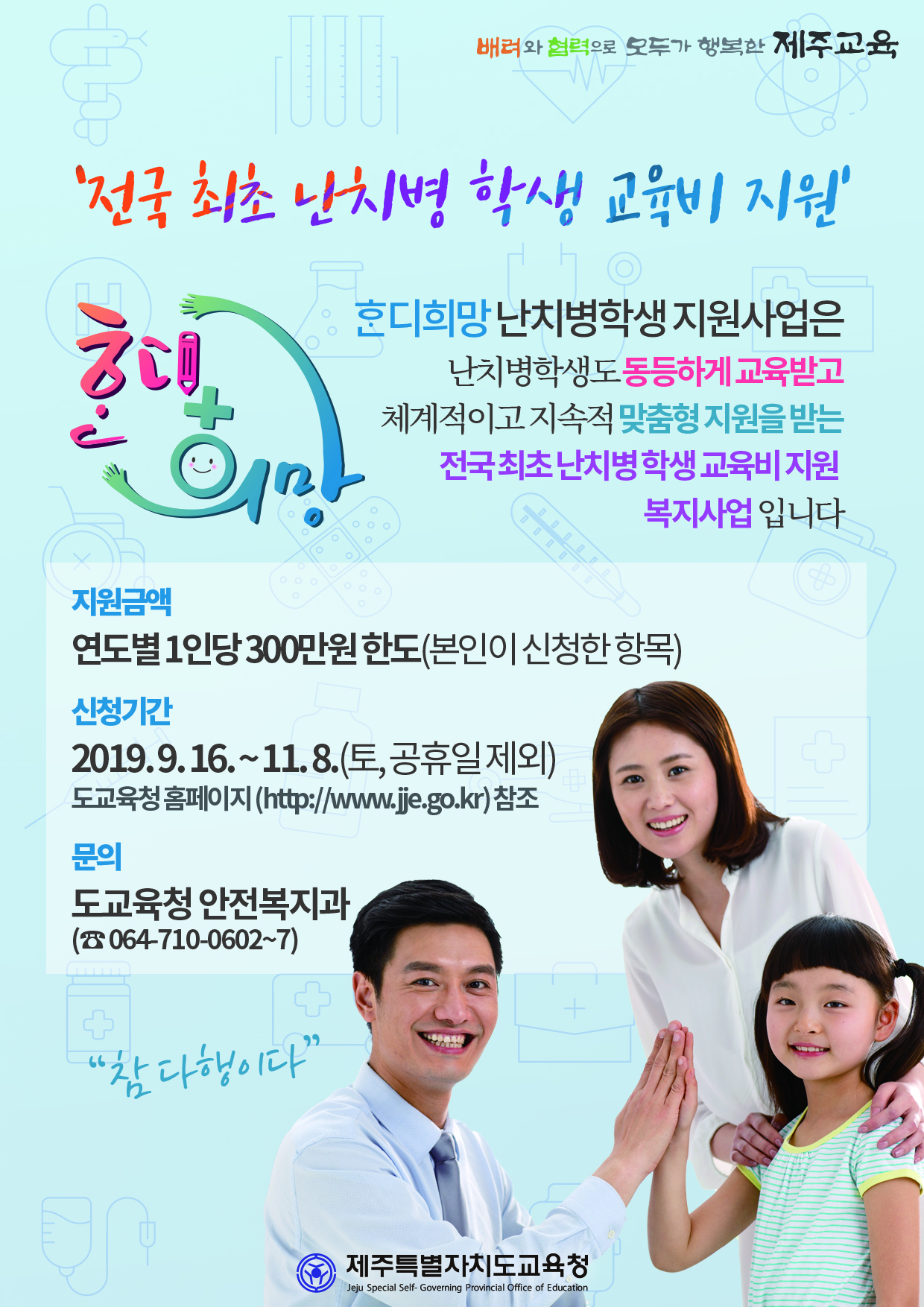 제주특별자치도교육청에서는 중증 질환을 앓고 있는 난치병학생들이 교육에서 차별받지 않고 연속적·체계적 지원을 통해 건강한 학교생활을 유지할 수 있도록 「제주특별자치도교육청 혼디희망 난치병학생 지원사업」을 추진하고 있습니다.