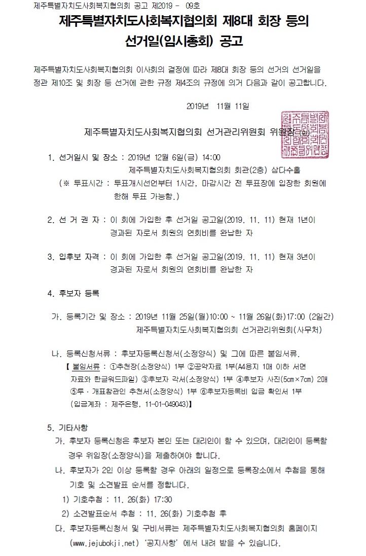 제8대 회장 등 선거일(임시총회)공고