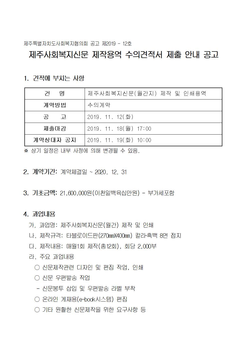 제주사회복지신문 제작용역 수의견적서 제출 안내 공고