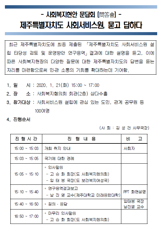 우리 협의회에서는 최근 최종 제출된 「제주특별자치도 사회서비스원 설립 타당성 검토 및 운영방안 연구용역」결과에 대한 설명을 듣고, 이에 따른 사회복지현장의 질의사항에 대한 제주특별자치도의 답변을 듣는‘문답회(問答會)’를 아래와 같이 개최할 예정입니다.