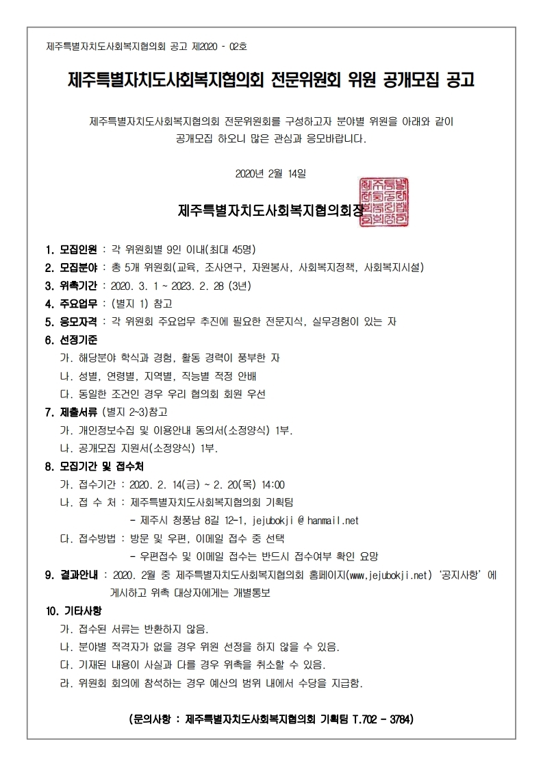 제주특별자치도사회복지협의회 전문위원회 위원 공개모집 공고