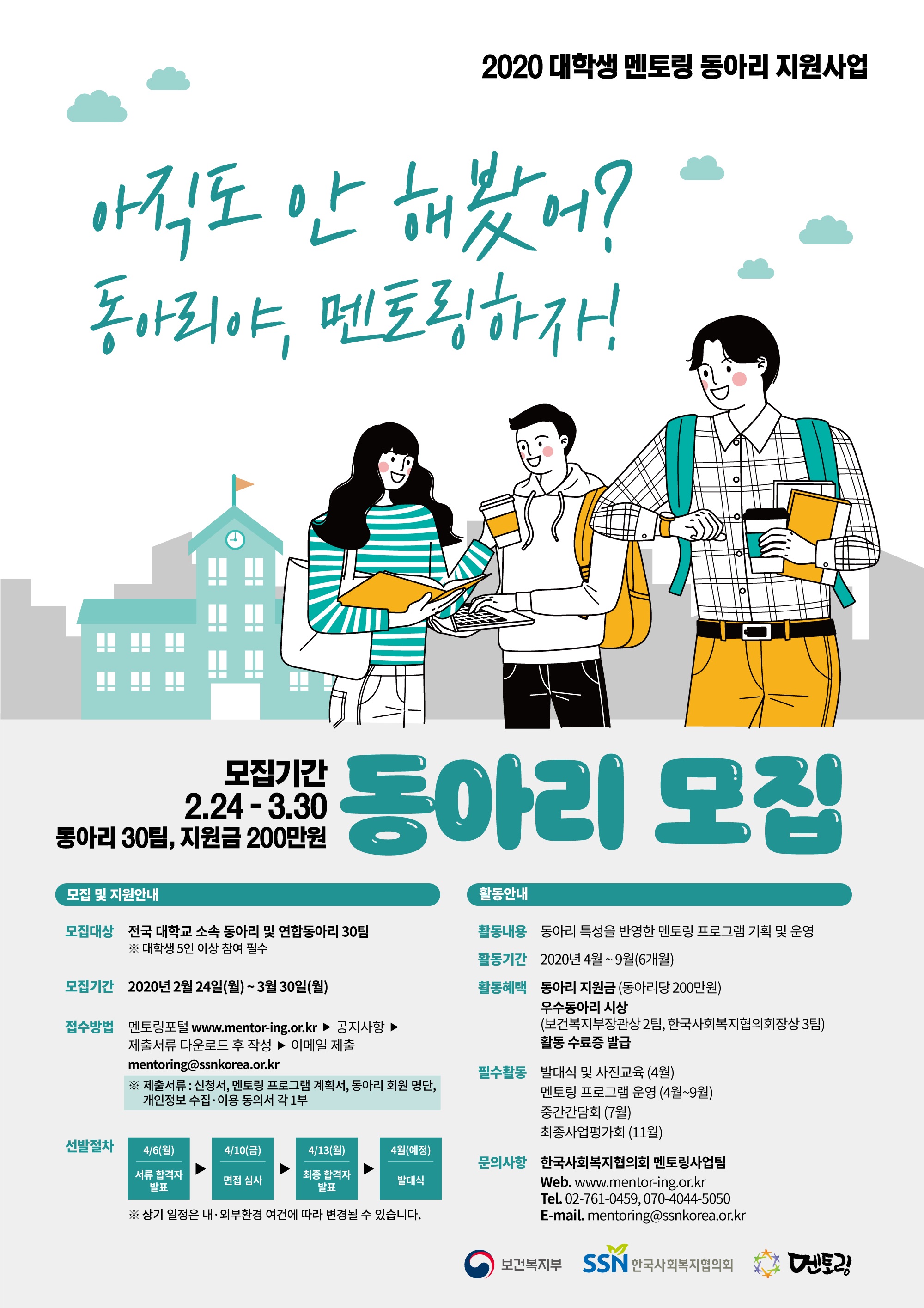 대학생의 멘토링 참여를 통한 새로운 나눔문화 확산을 위해 「대학생 멘토링 동아리 지원사업 “동아리야, 멘토링하자!”」 동아리를 모집합니다. 사회복지기관 및 일반단체에서도 소속인원 5명 이상의 대학생 동아리를 구성하여 신청할 수 있습니다.