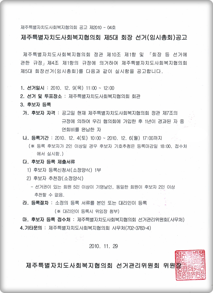 제주특별자치도사회복지협의회 제5대 회장 선거(임시총회) 공고