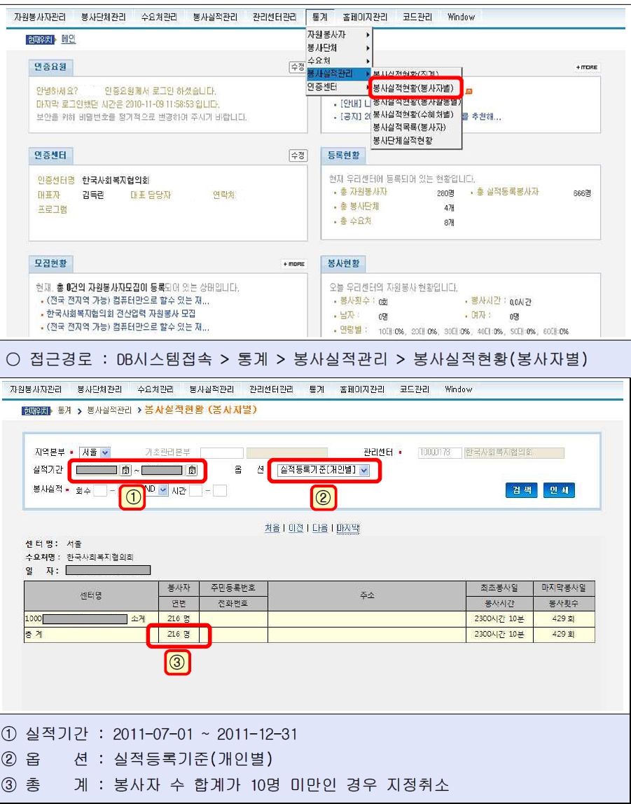 사회복지자원봉사 관리규정 제15조(관리센터지정취소 등)에 의거하여 인증센터 지정취소 예정대상 통보를 받은 센터에서는 본 페이지를 참고하여 인증센터 지정취소가 되지 않도록 협조하여 주시기 바랍니다. 2011년도 하반기 활동봉사자 수 검색방법을 함께 첨부합니다.