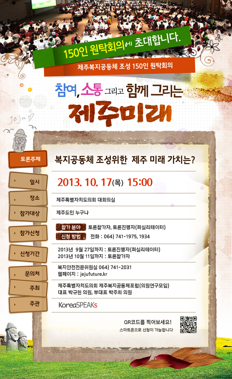제주특별자치도의회 의원연구모임인 제주복지공동체포럼에서는 제주도가 추진해야 할 미래가치 선정에 대한 추진방향을 제시하고자 각계각층의 제주도민을 모시고 원탁회의를 개최할 예정입니다.