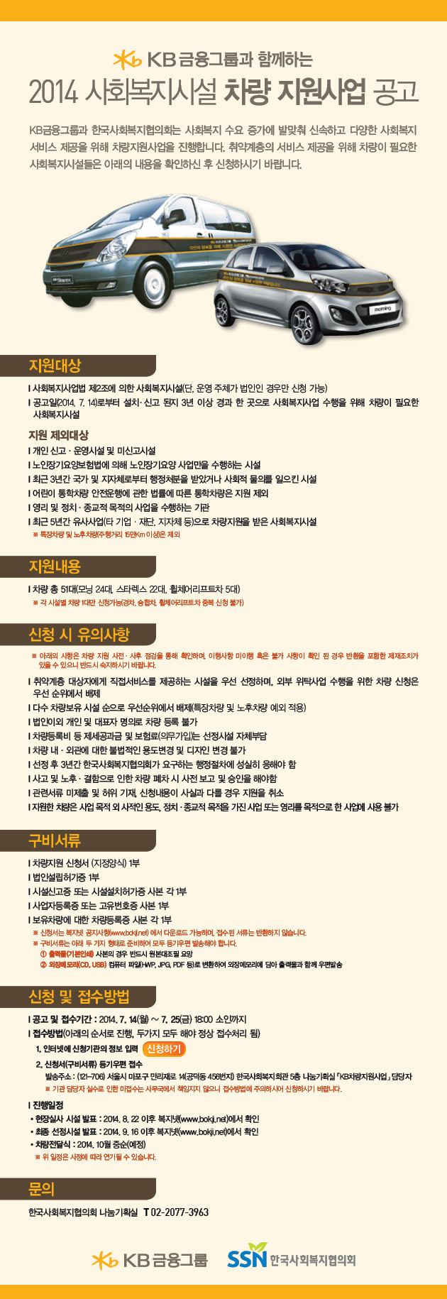 한국사회복지협의회에서 KB금융그룹의 후원으로 사회복지시설에 차량지원사업을 진행합니다.