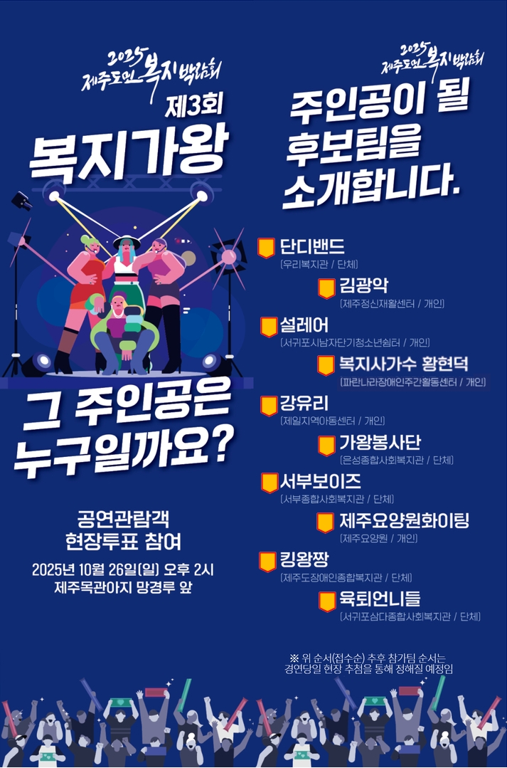 오는 10. 26(일)『2025 제주도민 복지박람회』부대행사로 진행되는 제3회 복지가왕 심사방법 중 관람객 현장투표가 함께 진행됩니다.