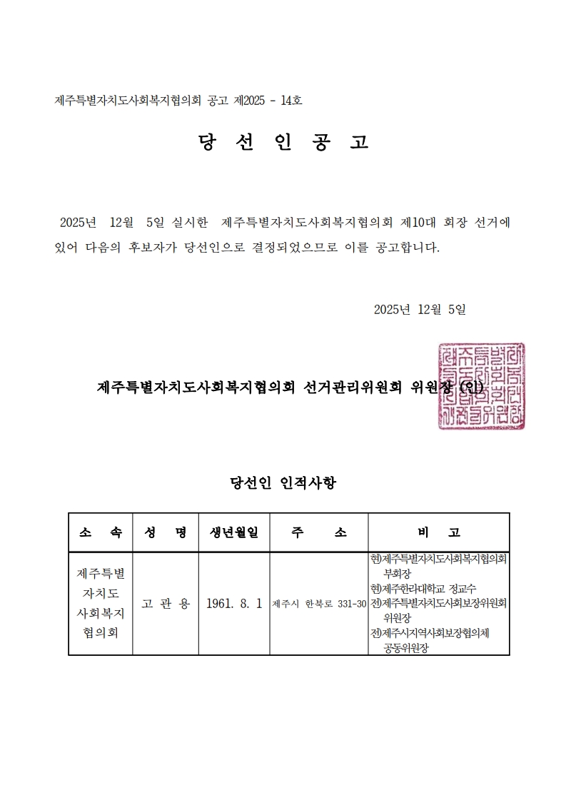 제10대 회장 선거 당선인 공고